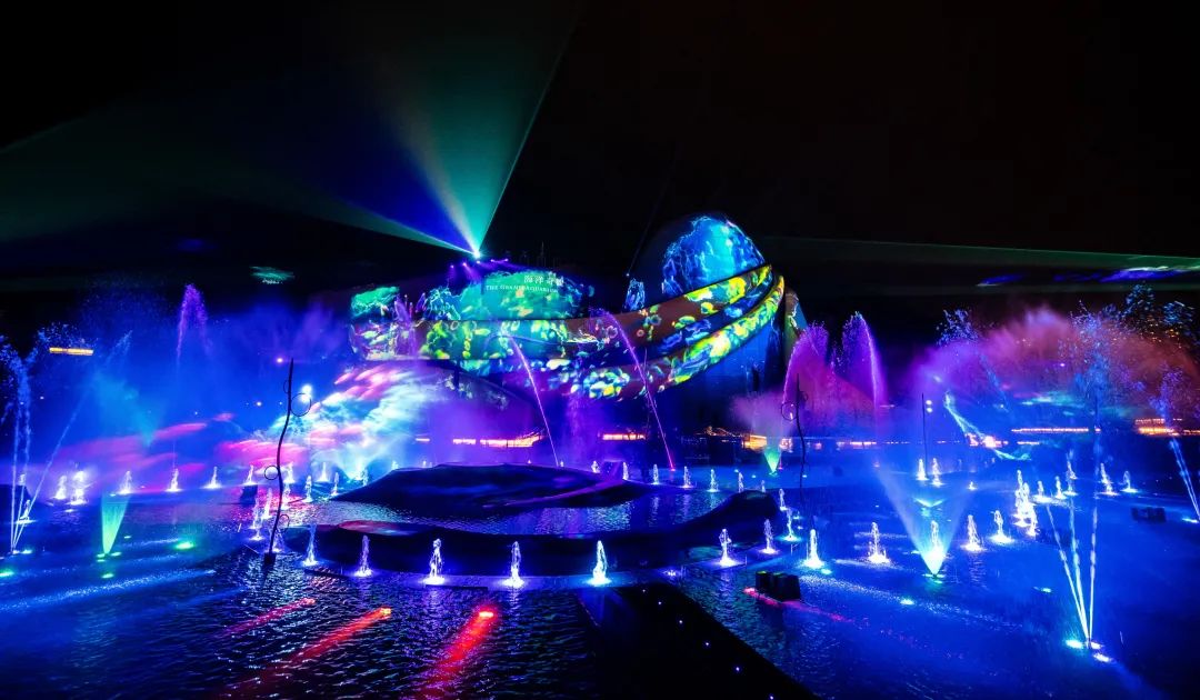 在另一个使用自定义绿屏镜头创建的场景中,一位传统粤剧演员从雾中升起并引发季风,与喷泉、火焰和激光效果的编舞以及原创管弦乐配乐同步,结局以对未来充满活力的可持续愿景而告终。