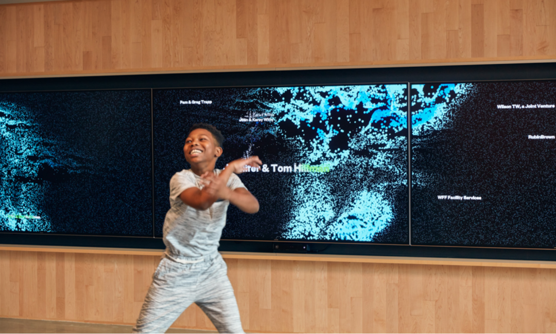 这种体验鼓励游客和社区成员用他们的身体探索和创造,将建筑的公共大厅变成一个表演空间。在任何时候,参观者都可以随着屏幕跳舞,通过他们的动作传导近百万个粒子的流体波的运动和颜色。这些粒子代表 COCA 社区,并聚集在一起形成捐助者的名称和重要的社区信息。