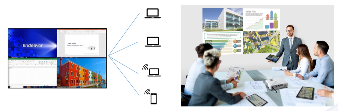 升级后的投影机更稳定,连接速度更快,切换设备更顺畅,且支持企业安全网络。主讲人在演示讲解时,可通过分屏功能实现多信号源共享一个大画面,无需频繁切换。