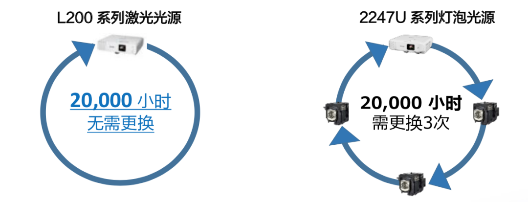 会议用机,使用频率高且单次使用时间较长,投影机的后续维护成本也是采购投影机时的重要考量因素。此次爱普生升级后带来了超长寿命激光光源,后续维护省心简单。