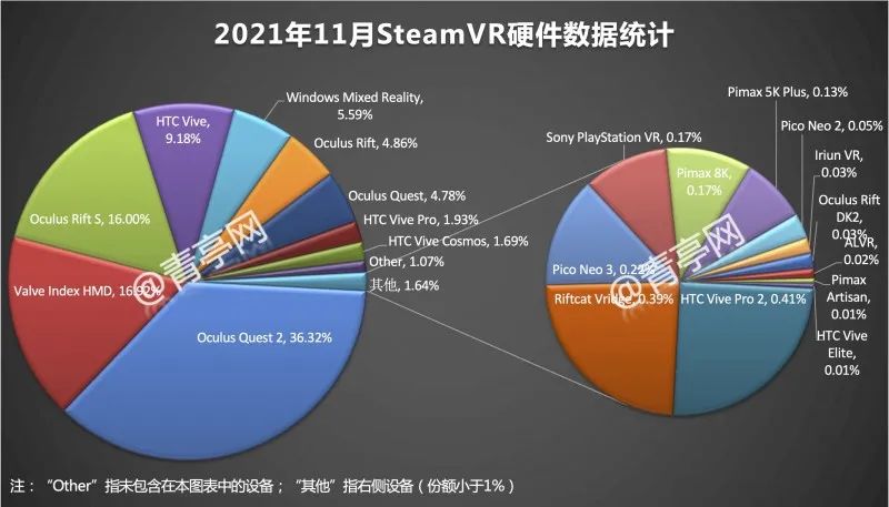 11月份SteamVR活跃设备前三位分别是:Oculus Quest 2(36.32% ↑)、Valve Index HMD(16.92% ↓)、Oculus Rift S(16.00% ↓)。SteamVR内容为6154款,VR独占内容共计5119款。Oculus Rift平台应用数量为999款,Oculus Quest平台应用数量为285款。