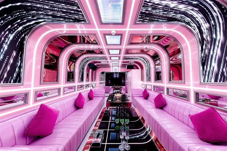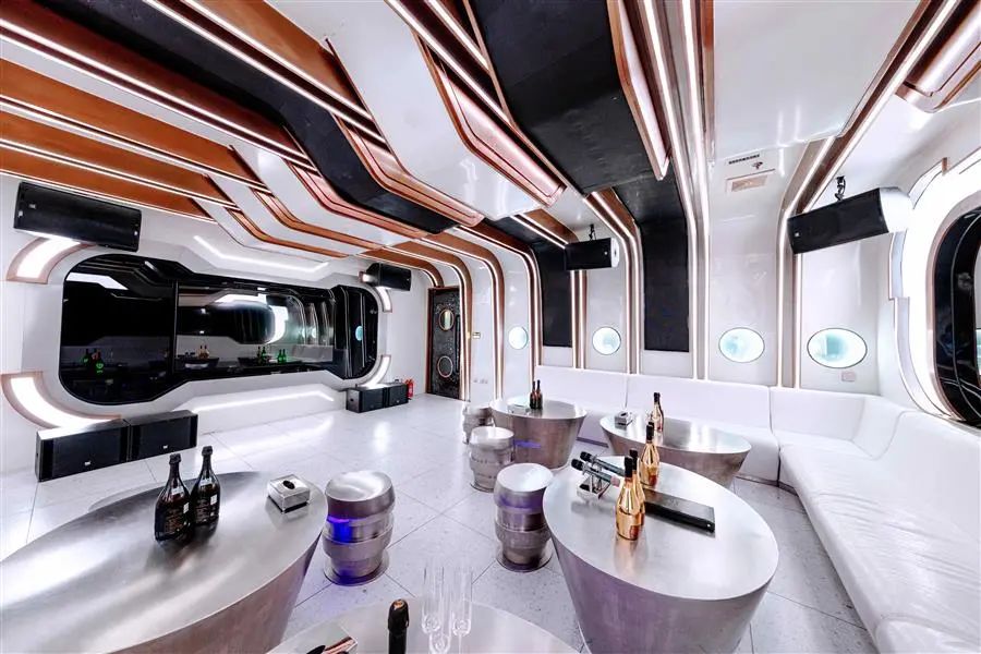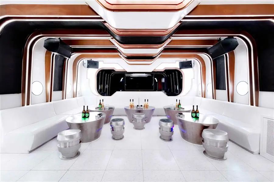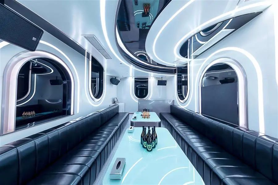 设计师在前厅入口设置回形动线的存包间,将前厅过于狭长的劣势化成优势及特点。过道墙面用金属管将Logo字母分割和再重新组合,形成顶面和墙面的装饰。流线型的发光金属管制造出时空穿梭的幻觉,挑动着动荡的情绪噪点,情绪得以发酵。