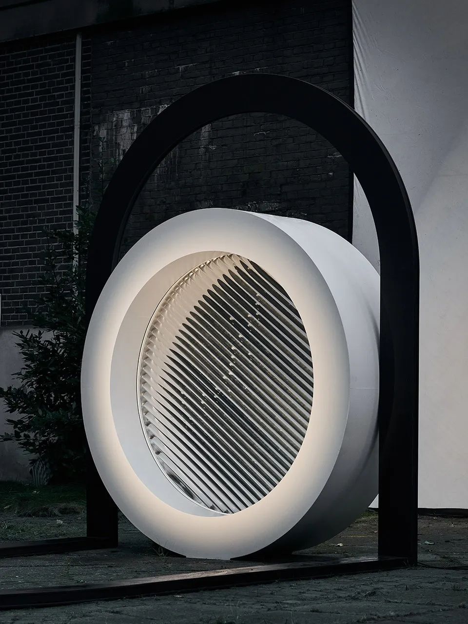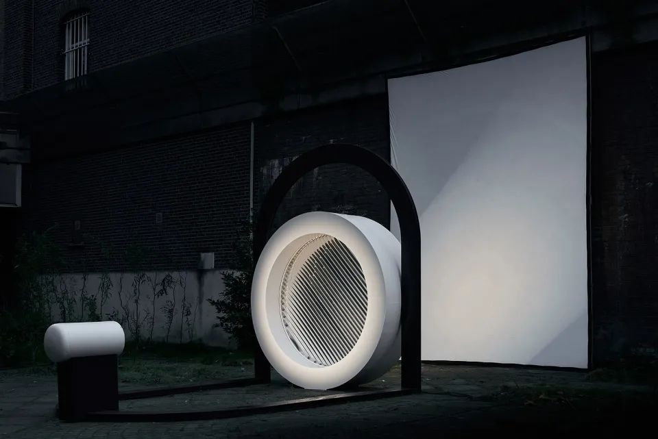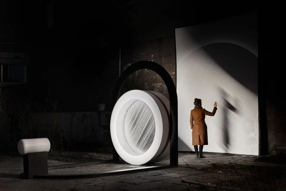 Sahabi将自己最新的装置作品命名为Plato,该室外互动装置高2.6米,宽2.2米。作品由一个3米长的椭圆形金属框架组成。框架后部呈90度折起,中间竖立着一个巨大的白色圆框,其中安装有透明透镜,围绕圆心缓慢旋转。灯光透过装置,形成变形的影子。