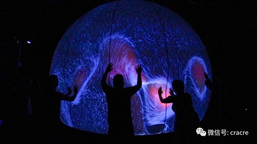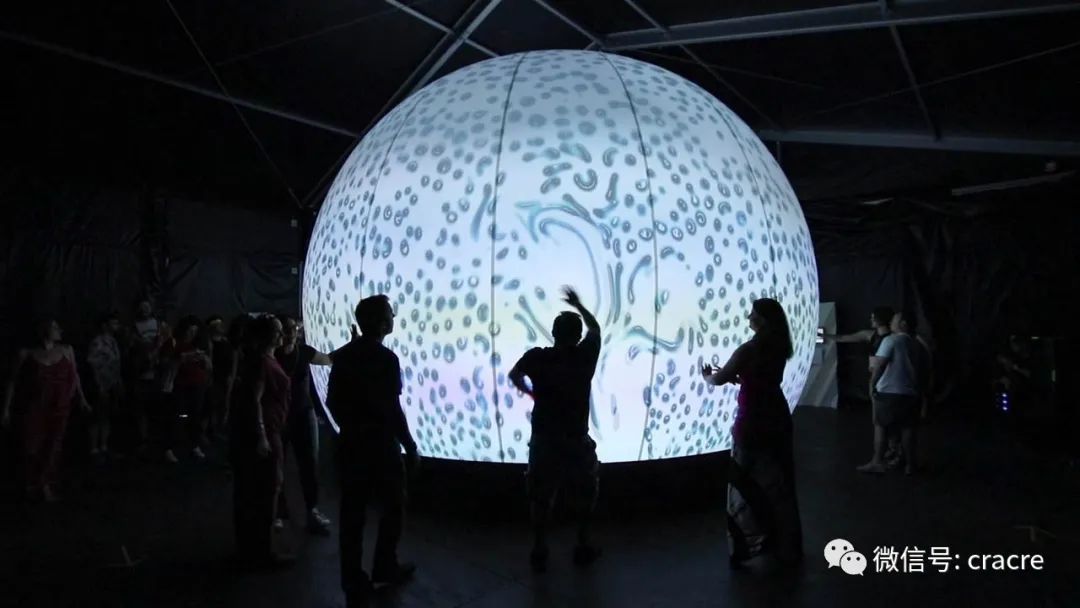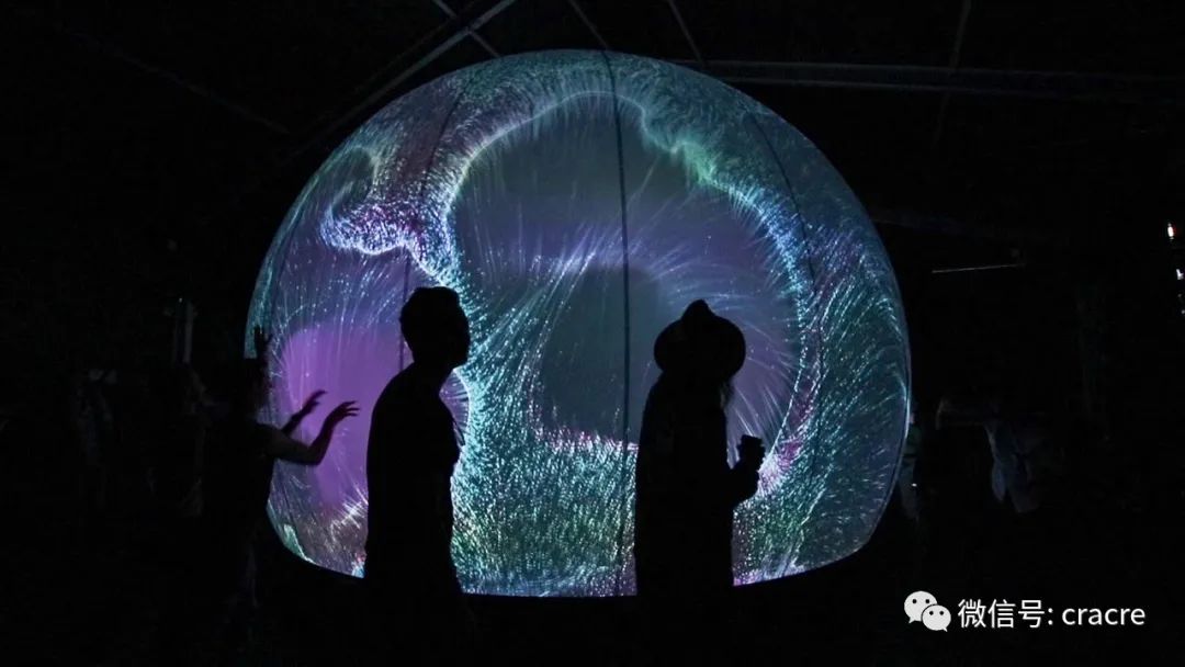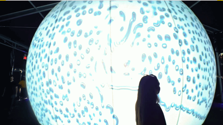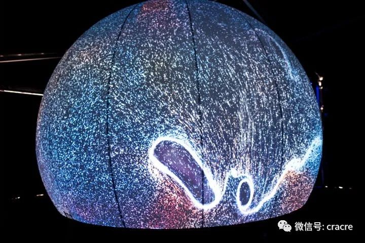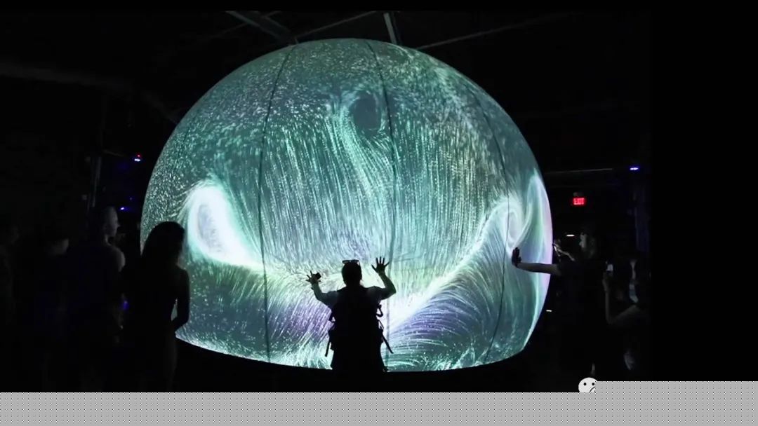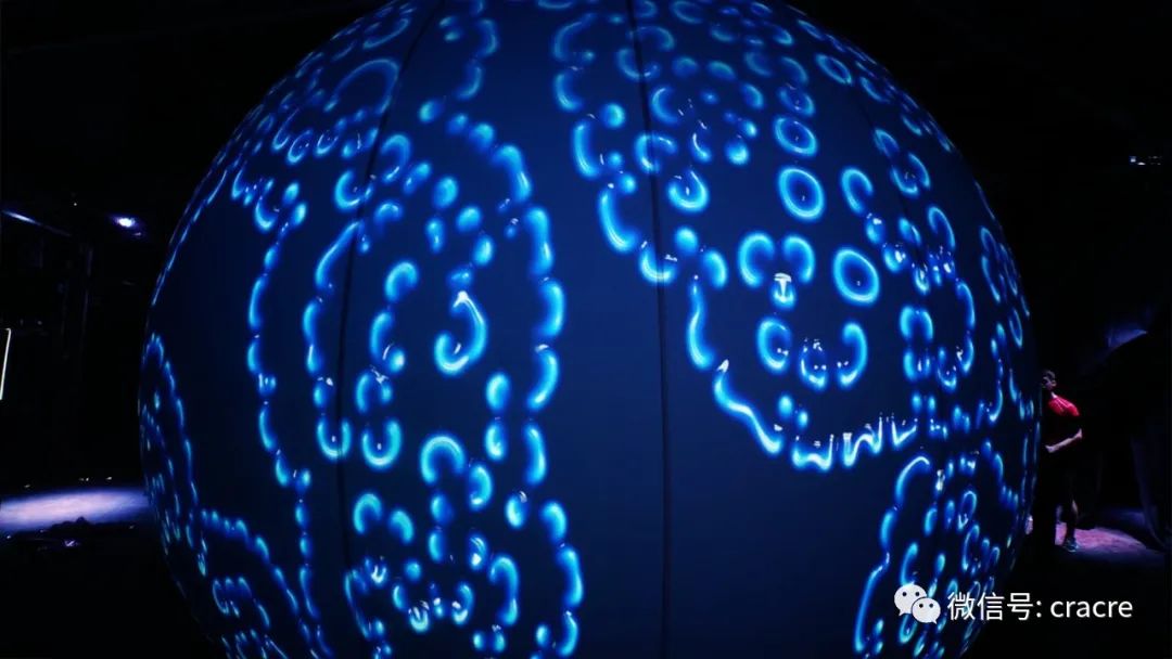 ”好玩个球“是一个巨大的球形(气模),球体的表面投影出不同的(粒子)画面。