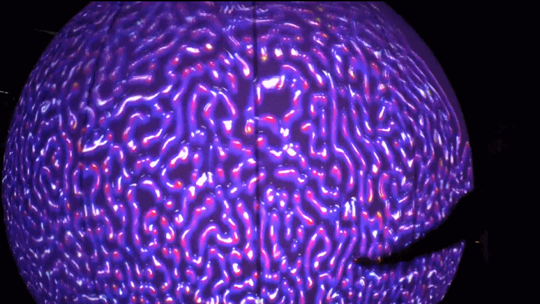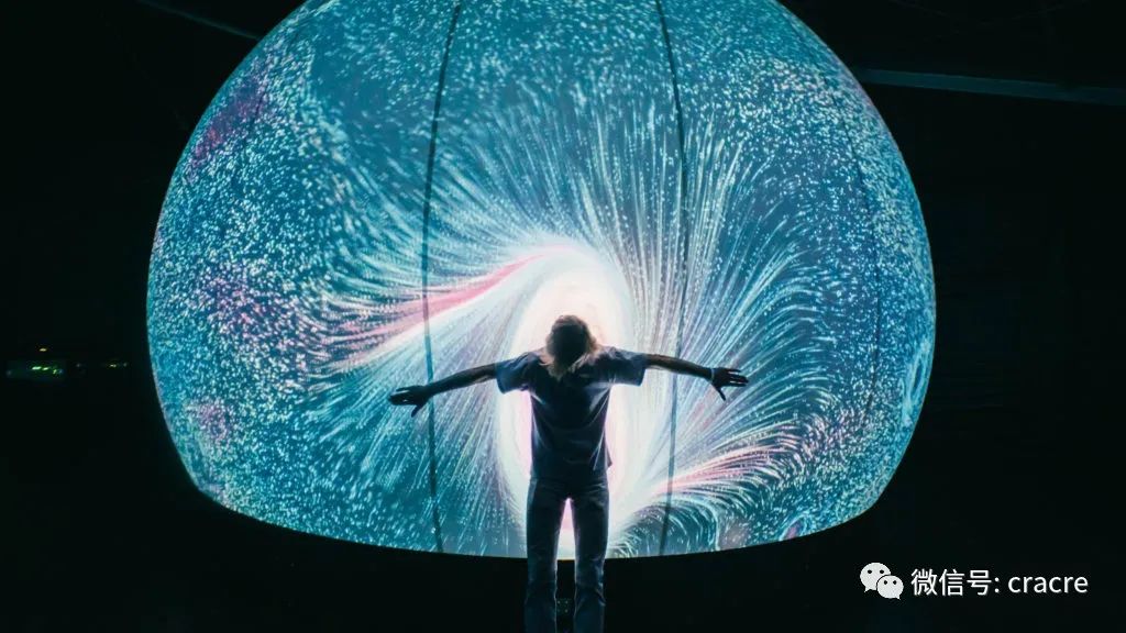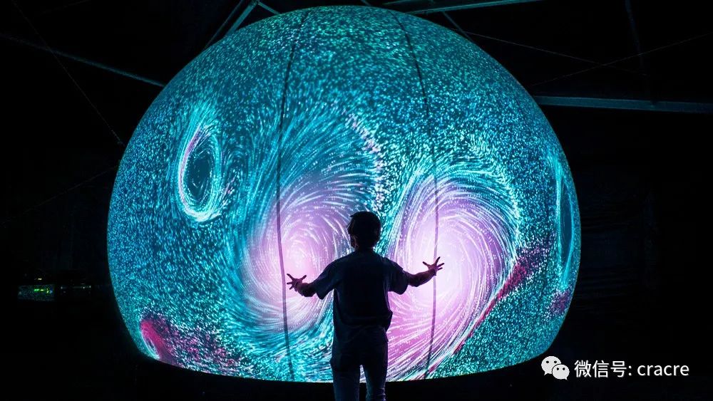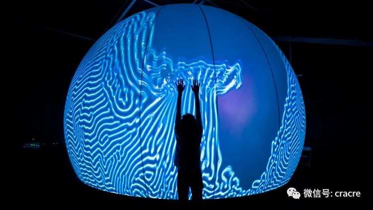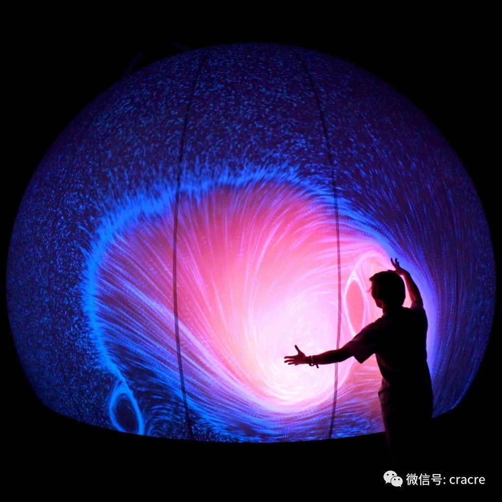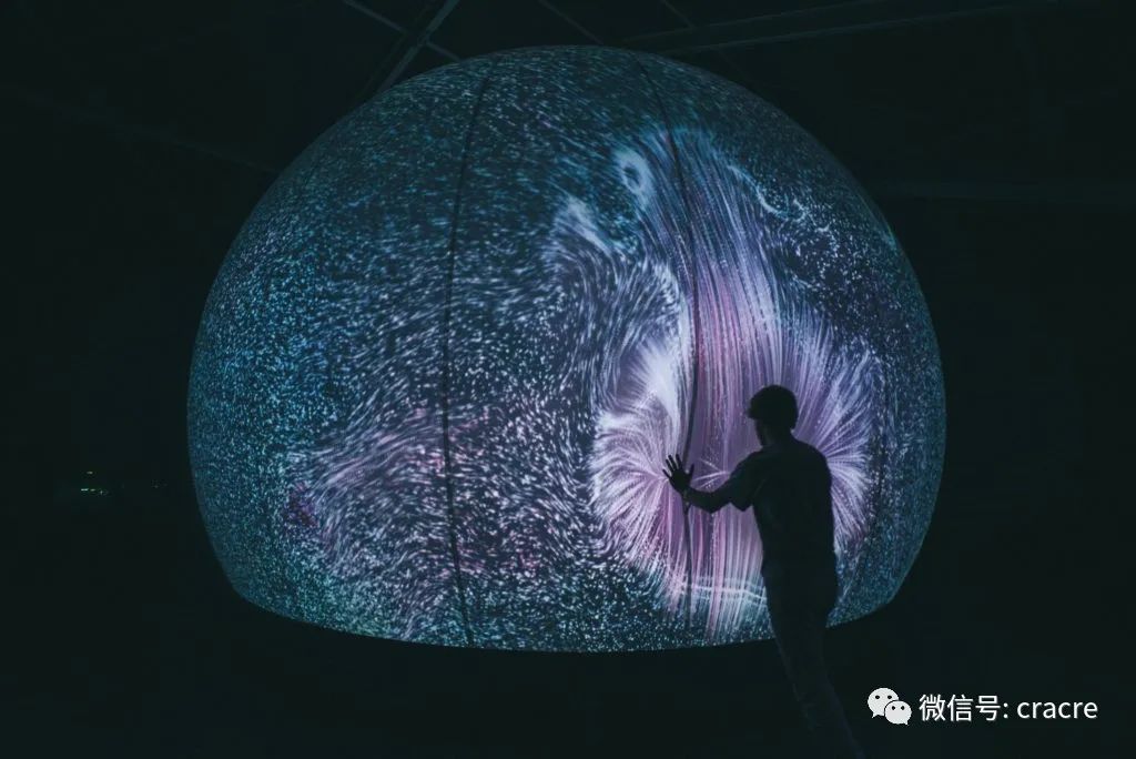 ”好玩个球“是一个巨大的球形(气模),球体的表面投影出不同的(粒子)画面。