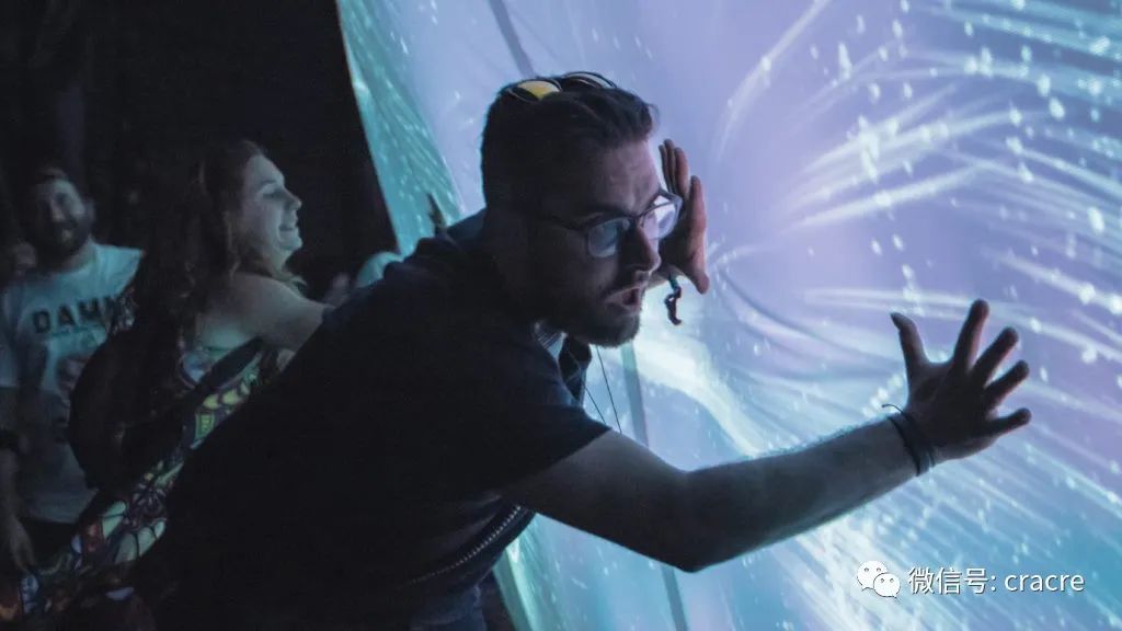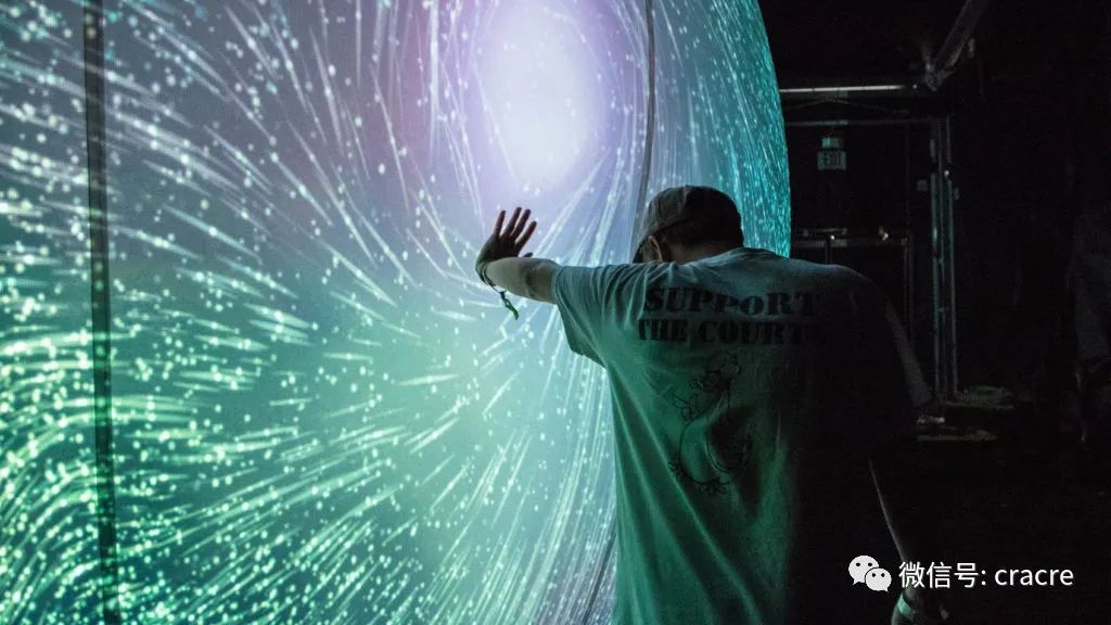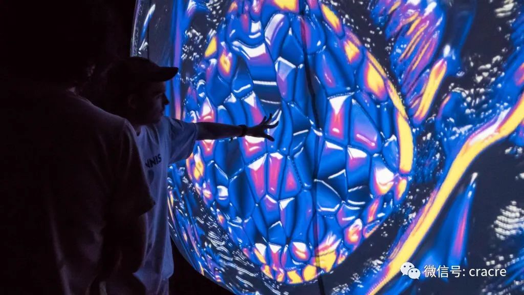 当体验者触摸球体,他就会像感应到一般。球体表面迅速出现游走的波纹,像是湍流不息的溪流,急速地挤压冲击着。