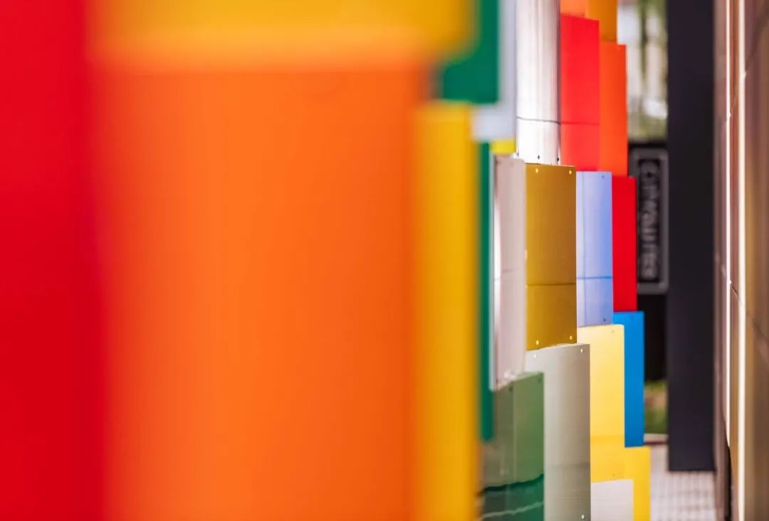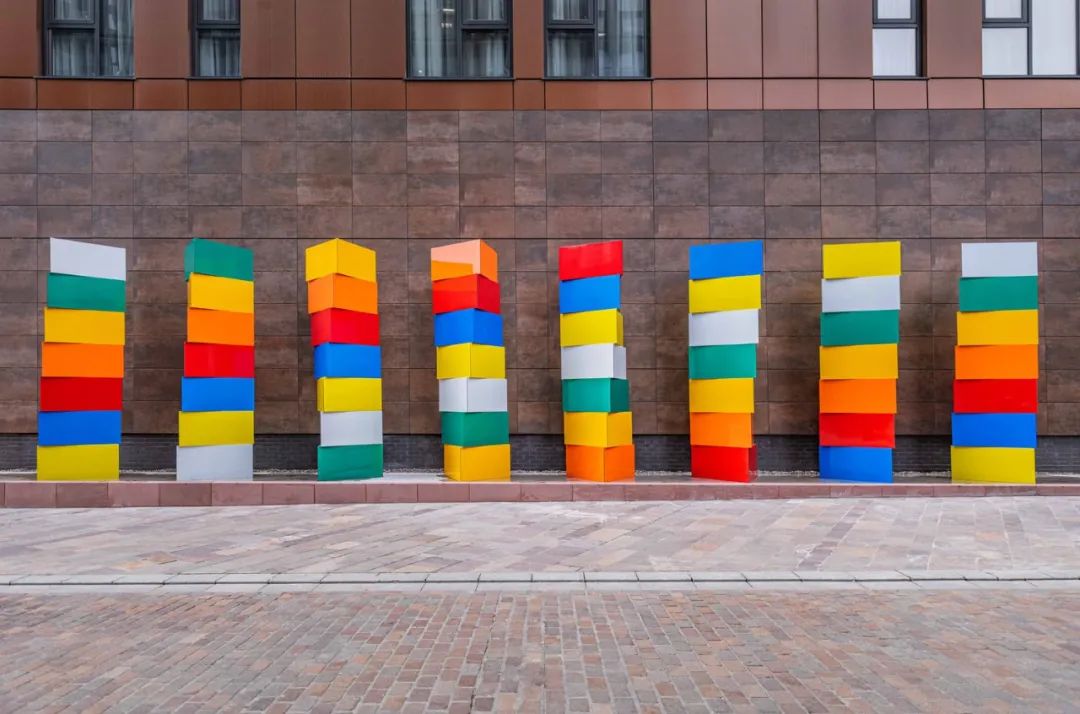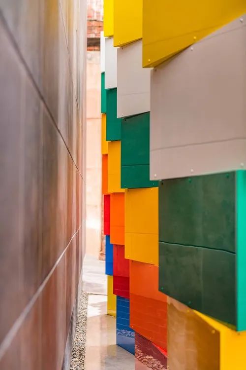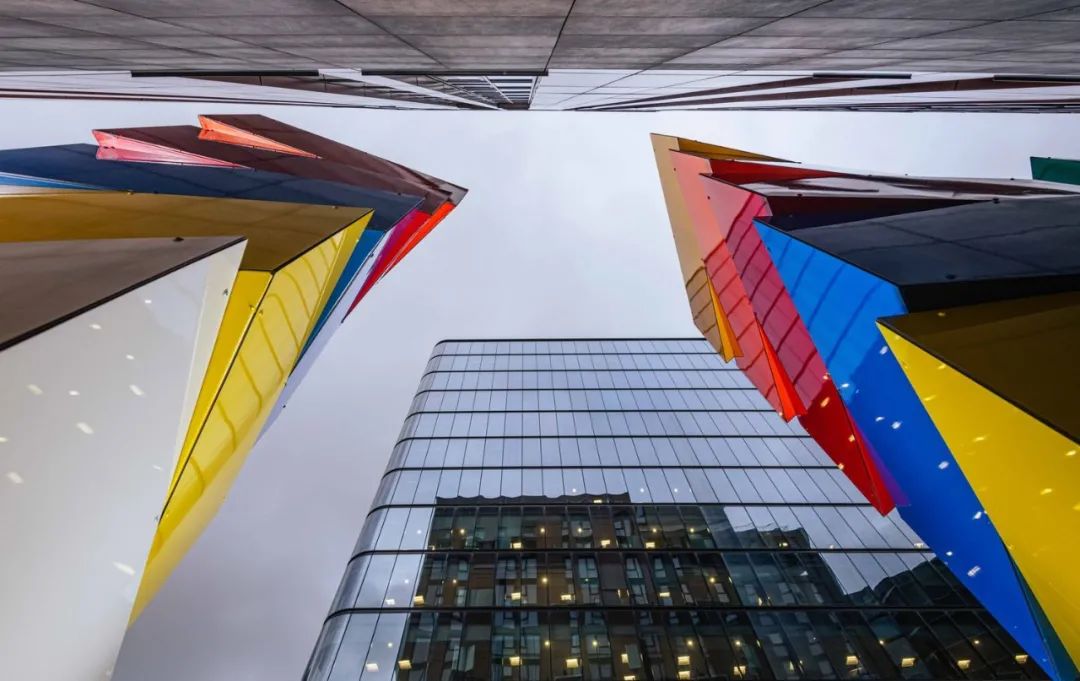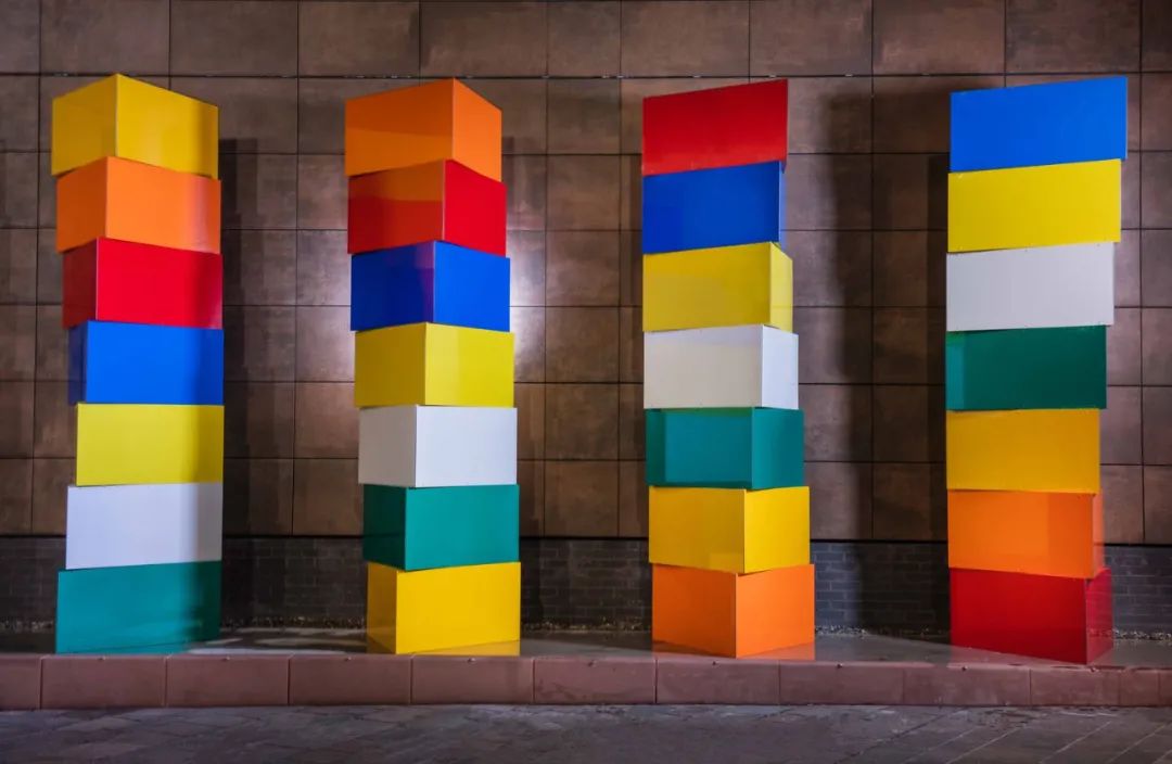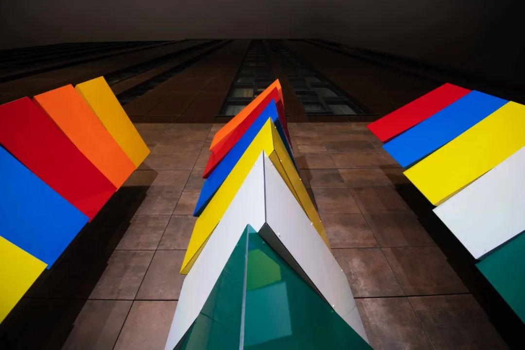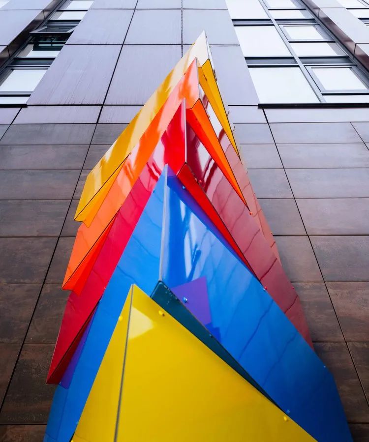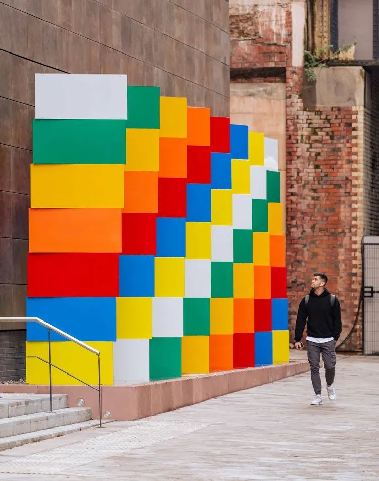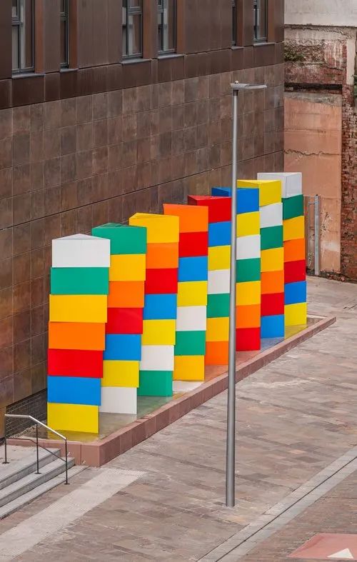 Liz West喜欢用色彩与光创造多采多姿的异想世界,「Slow Revolution」是个永久性艺术装置, 由56 个彩色三角棱镜组成,每个棱镜以 5 度角分开排列,并组成八个高耸的信标,营造观众走过时空间扭曲运动的视觉假象,为英国索尔福德的最新开发项目增添了冲击力,为观者呈现一场视觉飨宴。