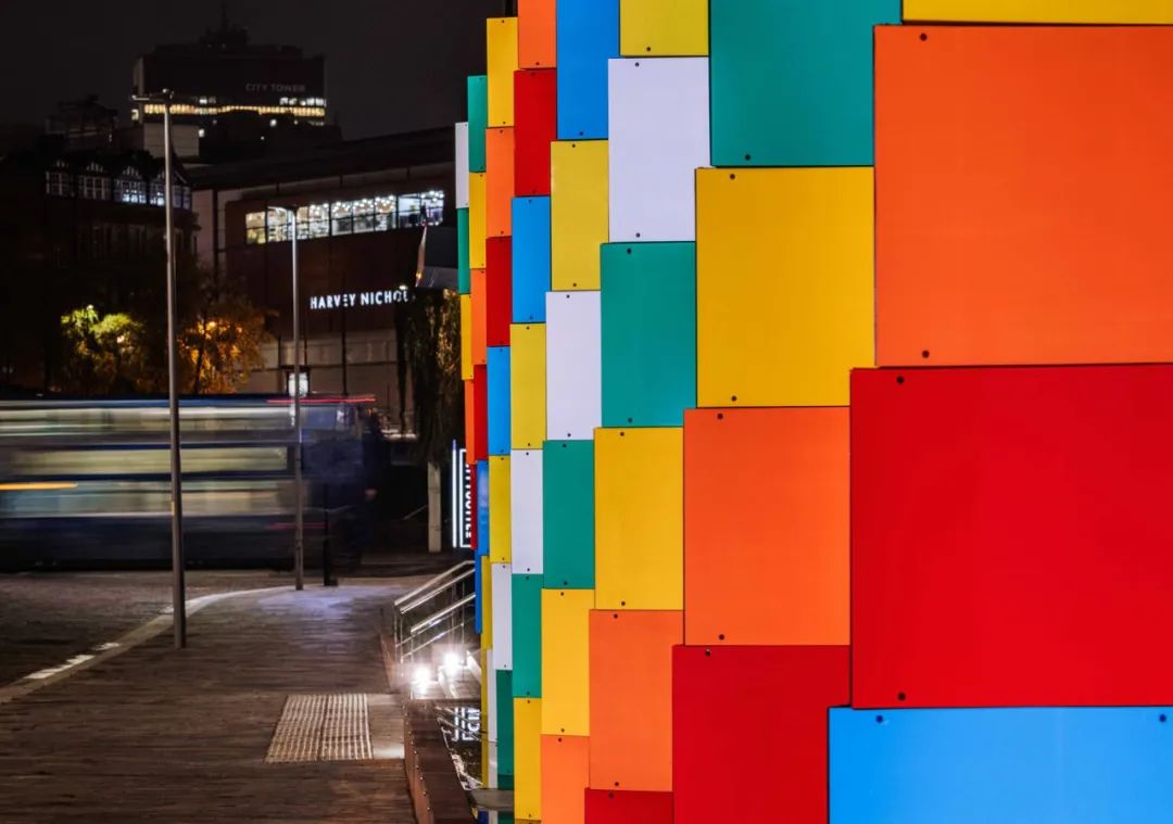色彩是 Liz West 作品的核心, 我们的城市通常是灰暗和棕色的世界,缺乏作为城市设计一部分的生动色彩——玻璃、混凝土、钢铁和石头构成了建筑物和街道设施的大部分内容,Liz West 非常热衷于在单色背景下使用一抹鲜艳的色彩来提亮和流行,为该地区增添光彩,让行人通过时感到更安全。使用复古- 反光膜创造了一种不需要人造光的‘光作品’,因为当灯光照射到这种街道标志材料上时,颜色会跳跃并变得生动起来。