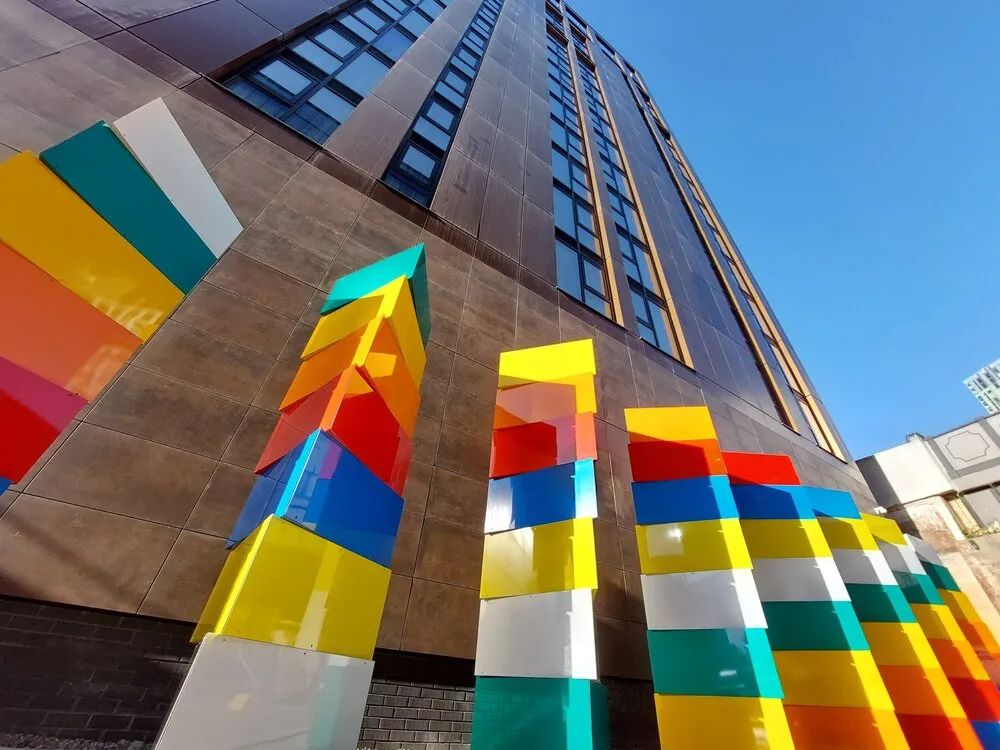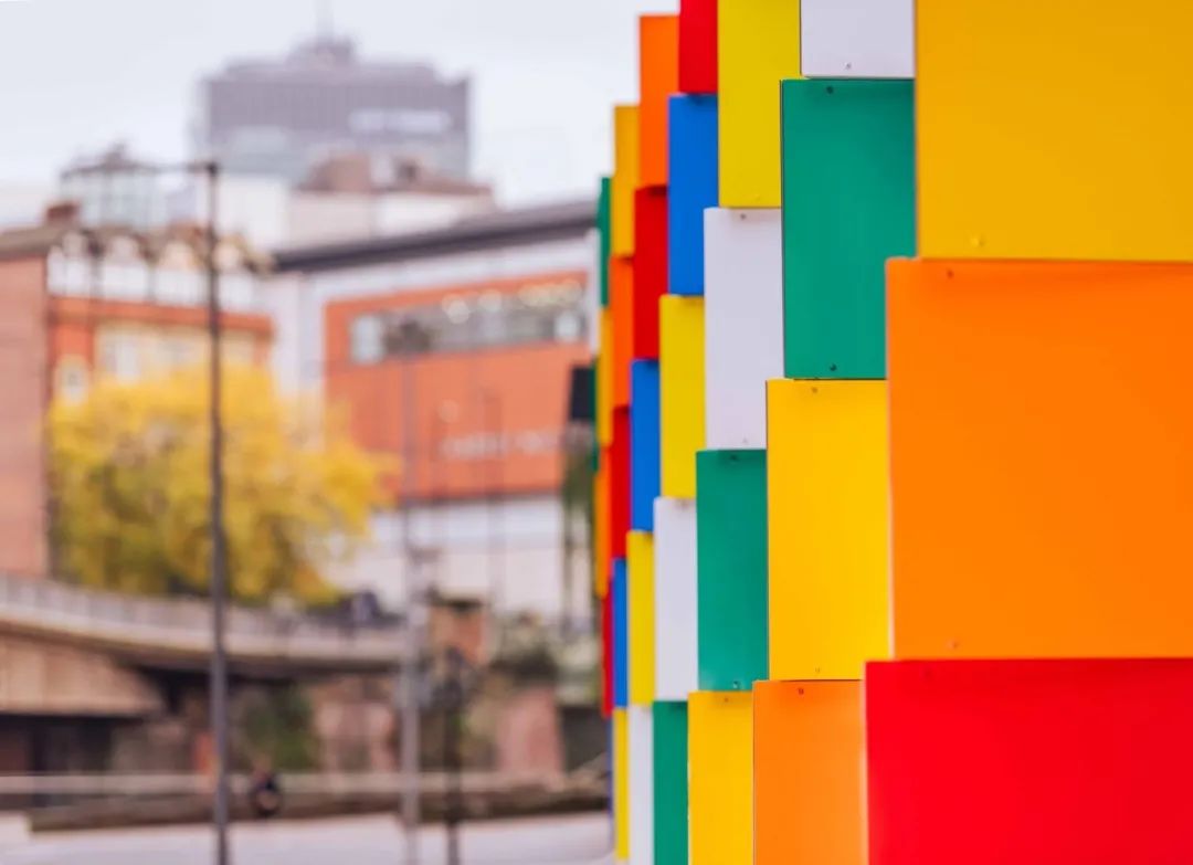 在作品的开发过程中,Liz 承认有太多关于该站点的社会和地理历史的信息需要消化并转化为清晰的、特定于站点的艺术品。“我喜欢索尔福德是染料厂的中心,本质上是北方的色彩工厂,与曼彻斯特的织布厂隔着艾威尔河,”她说。“这两个城市在工业革命的高峰期进行了奇妙的合作。在我的研究中,我也非常喜欢地理三角形——格林盖特三角形——在我的新作品中作为正式组成部分出现的元素。”
