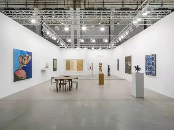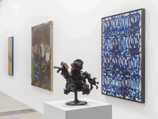 豪瑟沃斯展位中可以看到具象的绘画,比如乔治·康多的新作《人形肖像》。这是一个乍一看有些类似《猫和老鼠》里Jerry形象的画作,背景深浅蓝色对比带来虚无和“空洞”感,而对人物形象的极致抽象,则在试图向人们展示怪诞的当代社会。除绘画外,画廊还悬挂了很多摄影作品,比如辛迪·舍曼的两幅摄影作品《无题》。作品延续了她对人物尤其是女性的一贯探索。舍曼将摄影作品与电影相分离,通过对场景、服装以及道具的运用,展示她对人们自我意识的反思。作品带给人最大的感受是,它虽独立于电影,却仍具有充沛的情节和情感。布尔乔亚的头部雕塑《无题》,并不是传统意义上的肖像或特定人物的形象,而是以人类头部特征以及雕塑的构造、缝制方式,探索了一系列心理表达和复杂的情绪状态——爱、性、痛苦与死亡。