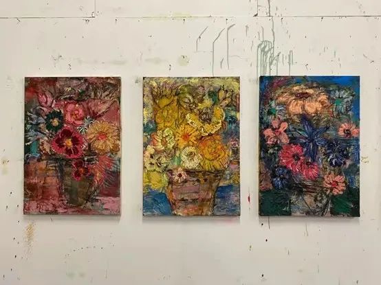 丹尼尔·克鲁斯-丘博(Daniel Crews-Chubb)于2020年创作的《花卉》(Flowers)系列作品,有着明显的“梵高”意味。色彩明暗、深浅、冷暖对比与梵高相似,但《花卉》又绵延着艺术家浓重的拼贴绘画风格。作品里看似杂乱的笔触,也带有一定张扬与不羁的味道。而展览背景板上零星的泼墨也增添了作品的趣味。