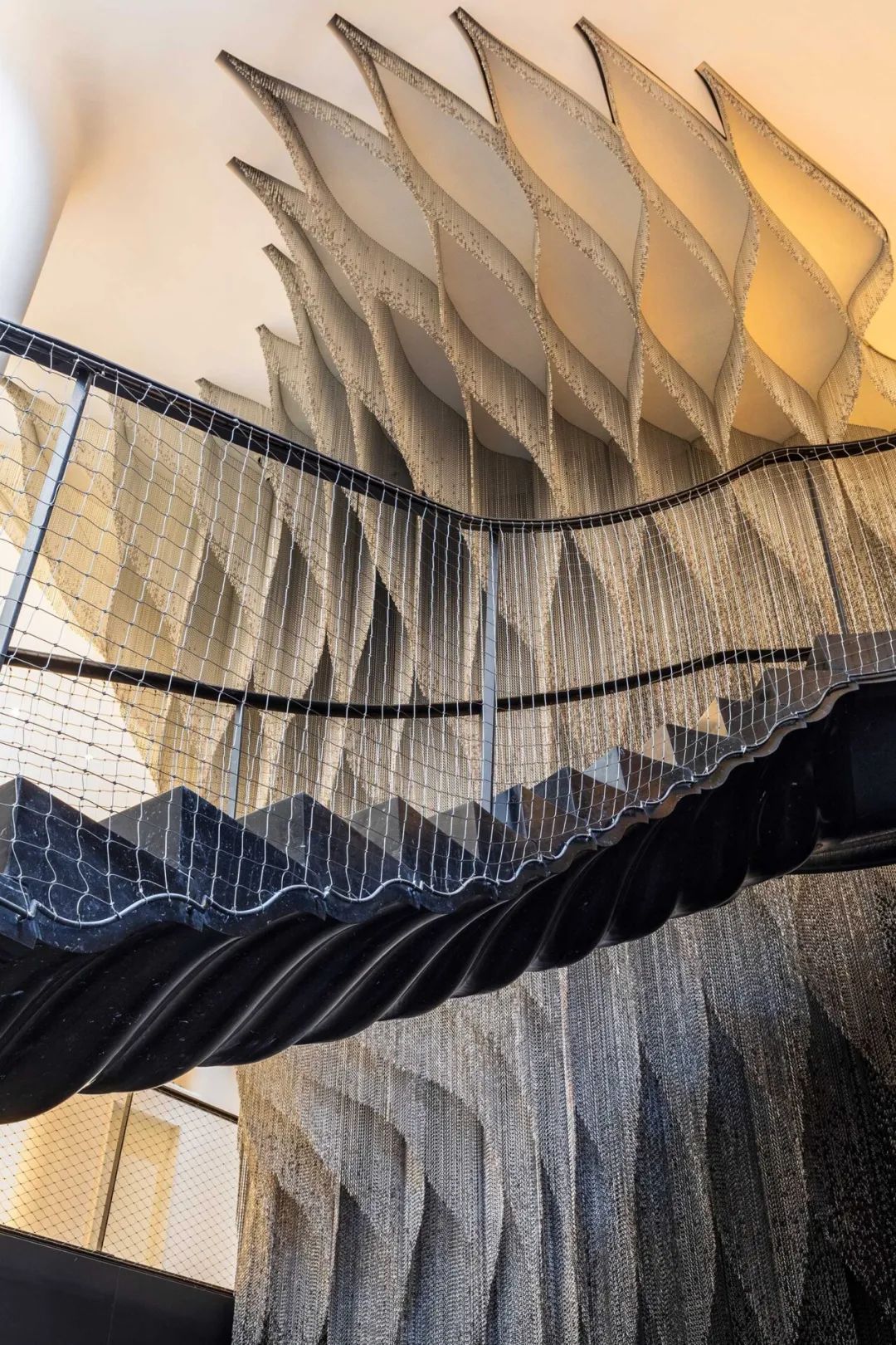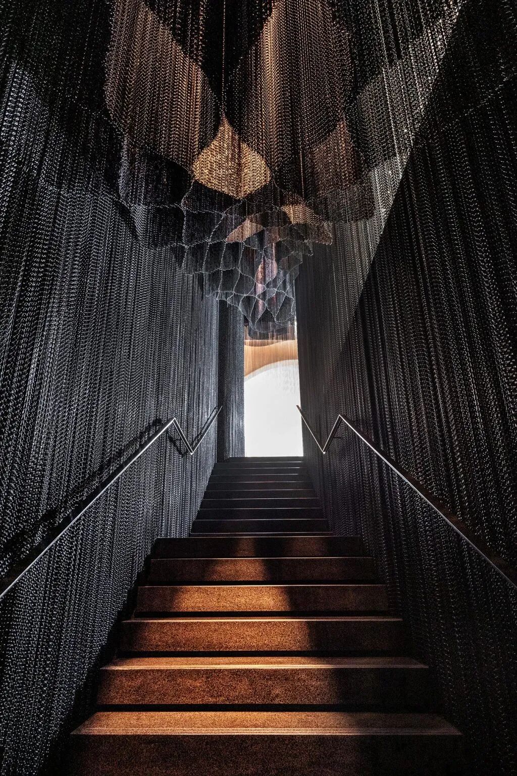 闪烁的链帘在空间周围像万花筒般反射着光线,与隈研吾所描述的异想天开的缤纷建筑形成鲜明的对比。由于材料的原因,巴特罗之家的天花板配备了特殊的吸音板,以消除链条叮当声所产生的任何噪音。