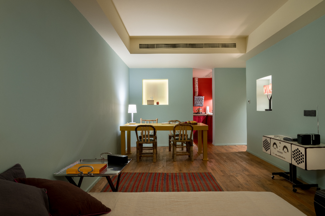 豪宅小区森严高冷,内部休闲设施一应俱全,大门紧闭,远离人烟。房子平数大小,是否直接决定着幸福指数,亦或更关键的变量是人。在今天的文章里,有人愉悦地搬进老破小,亦有人让没有围墙的大学走入社区…这样的小区登上舞台,引人注目,起因是一位60多岁的老外搬了进来。这里的居民经常看到他骑着共享单车兜圈,在楼下端着一杯咖啡,试图友好地和人们聊聊天。Aldo Cibic,66岁的意大利人,孟菲斯学派创始人之一,同济大学设计创意学院教授。孟菲斯运动是始于20世纪80年代的一场著名设计运动,后现代主义设计潮流的代表之一,具有划时代意义。抱持着“让平庸和墨守成规的人们自由生活”的愿望,他们反对任何限制设计思维的固有概念。用鲜明的色调、怪诞的几何拼接、开放的设计思维打破设计常规。这似乎也解释了,为什么一位大师来到上海不爱花园洋房和市中心的繁荣,反倒落脚在上海34㎡的老社区。我们采访了好公社社长陆洲:“虽然他60多岁了,但心态非常年轻,可能只有16岁吧。他有一颗求知冒险的心,为了创作,愿意尝试很多新的东西。”色彩明快,几何造型极简,孟菲斯的反叛美学在这展露无遗。房子里的家具都是从淘宝买的,更多的是他的收藏,以及自己设计的作品,比如方桌和台灯。不可否认,Aldo Cibic的家如此惊艳,能有大片留白,脱不开室内的东西真的很少。他为数不多的几件衣物就躺在一个行李箱里。