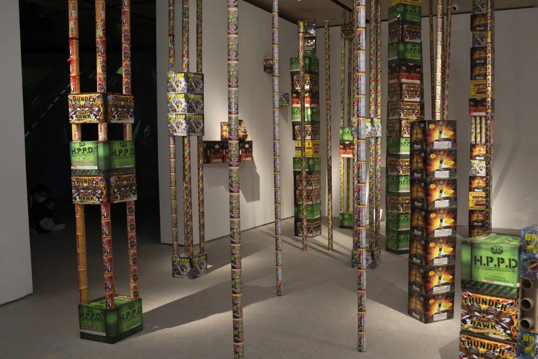 Wu Xiaohai, Colorful Clouds, production materials of Japanese fireworks exported from Liuyang including wood, charcoal and a video