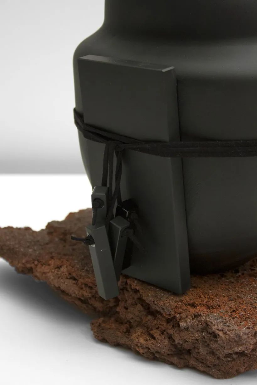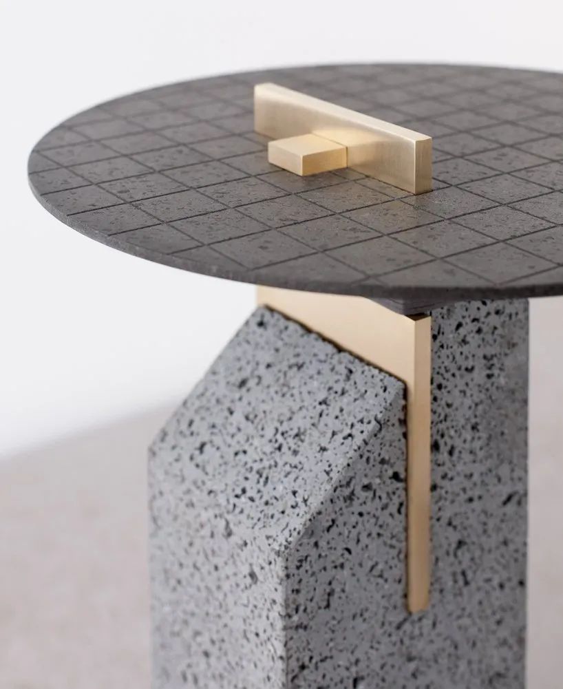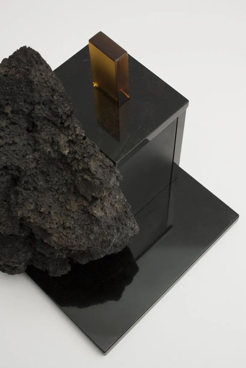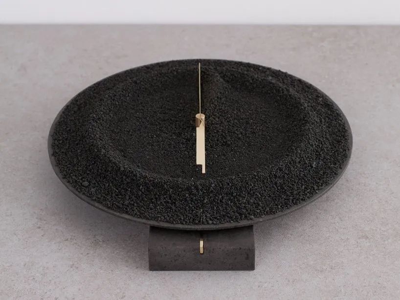 而二人在2014年的米兰设计周期间展出的“自然化石”系列,则呈现出一种将线性与野兽派风格并重的形式。由玄武岩雕刻而成的几何体与裂缝状结构的黄铜元素相结合,制成的凳子、咖啡桌与时钟具有由熔岩砂形成的独特粗粝表面。其中,时钟被解构为三块玄武岩水平板,代表小时、分钟和秒的流逝,呈现出诗意的浪漫气息。