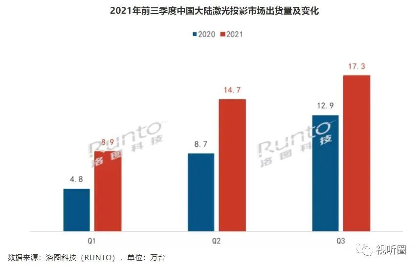 数据显示,2021年第三季度中国大陆激光投影市场出货量为17.3万台,同比增长34%;从前三季度累计来看,中国大陆激光投影市场出货量达到40.9万台,相比去年同期增长55%。