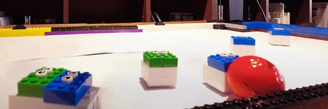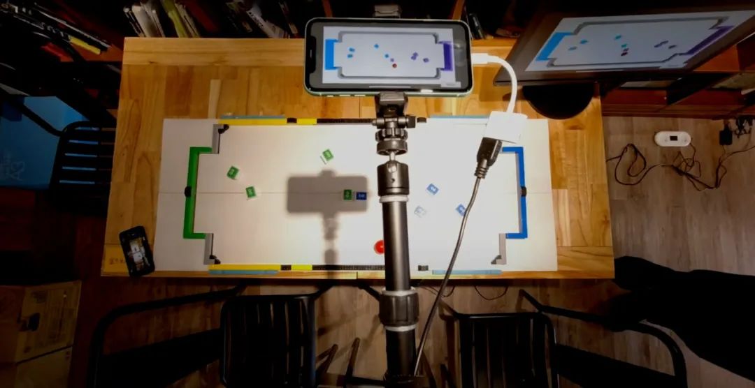 我们使用一个高尔夫球来代表足球,并将其涂成红色以提高辨识度。不可思议的是,我们仅用一部 iPhone 就能完成足球的探测,控制所有八个机器人(这是一场四对四的足球比赛),再使用 ML-Agents 模型进行推导。