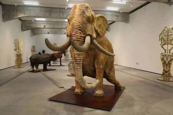 邬建安:哈哈不是,那个是玻璃钢制的。做的有点儿像。犀牛、老虎都不可能有真的,其它的动物也都是假的,是拿别的动物的毛粘出来的。所以展览要在黑暗下,不能灯点亮,灯点亮了看着就不真实了。