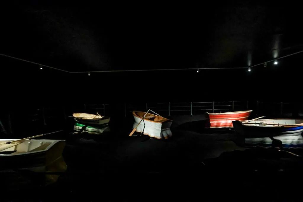 ▲ 雷安德罗·埃利希 Leandro Erlich ,《反射港湾》2014,铁质结构,木,玻璃钢翻模船,黑地毯,制动系统 (致谢:艺术家和常青画廊)