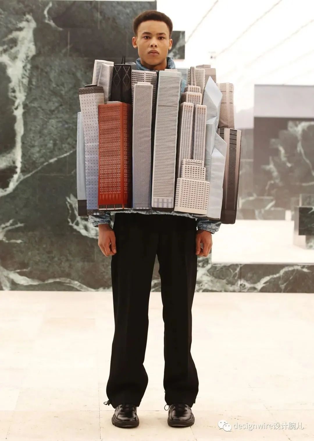 从头到脚,从生活到认知方式,人生来就被训练着去迎合社会所勾勒的标准,以识别不同角色。Virgil Abloh运用纽约、巴黎的3D地标建筑、飞机等流行元素和标语,试图重新定义这些角色与社会相关的文化背景预设。