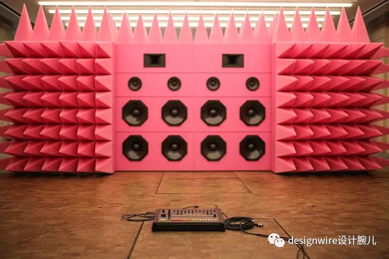 12 英寸 Voices 的新声音装置是他于2019年9月在法国巴黎拉斐特“MANIFESTO(宣言)”的群展中展示的大型作品。巨大的粉色音箱,上面包裹着尖头形状的隔音泡沫板,Virgil还在空间中现场表演展示。