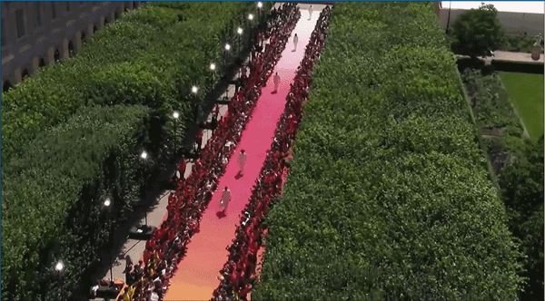秀场位于巴黎心脏四百年历史的皇家宫殿,最初的国家首相黎塞留官邸,如今的最高政府机构,经历过岁月的洗礼,今天这里成为活力的时尚殿堂。宫殿花园林荫大道中,一串绚丽的彩虹成为法式优雅环境中的亮点。