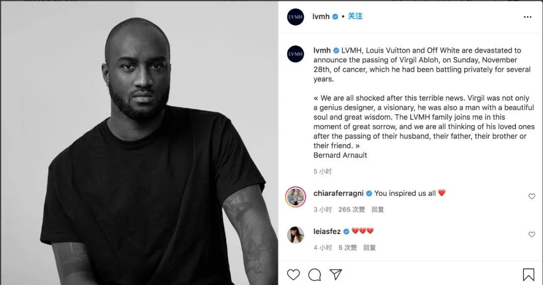 北京时间今日清晨,LVMH 及 Virgil Abloh 个人账号发布了年仅41岁的Virgil Abloh,在与心脏血管肉瘤秘密斗争了两年之后离开人世的消息。而确诊以来的两年中,Abloh仍坚持活跃于时尚秀场、艺术、音乐、商业之间。无数人为天妒英才而惋惜,怀念着这位传奇留下的时尚遗产。