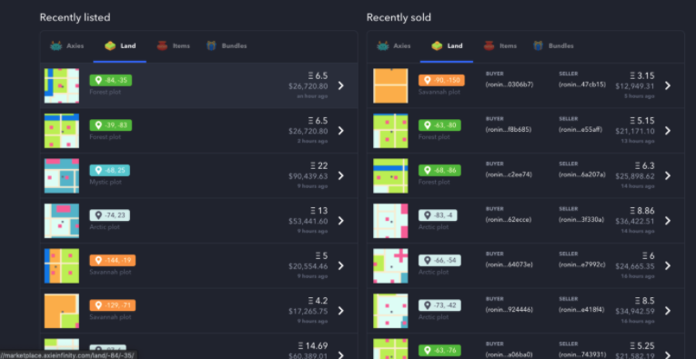 Axie Infinity 最近出售和上市的土地