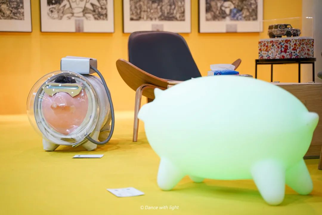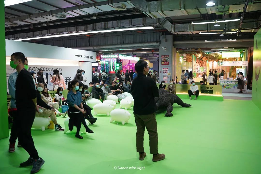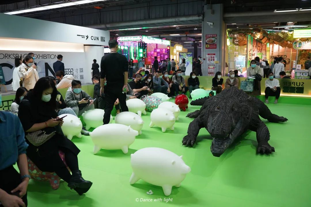 在广州国际采购中心负一层的12号馆内,超级BBB展区现场,这群“PIG”又成群结队,充当起了座椅。