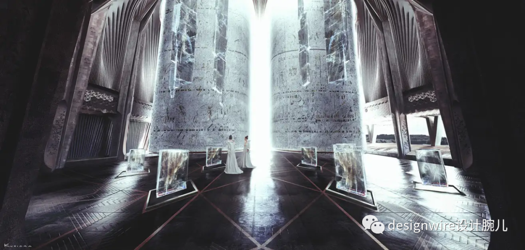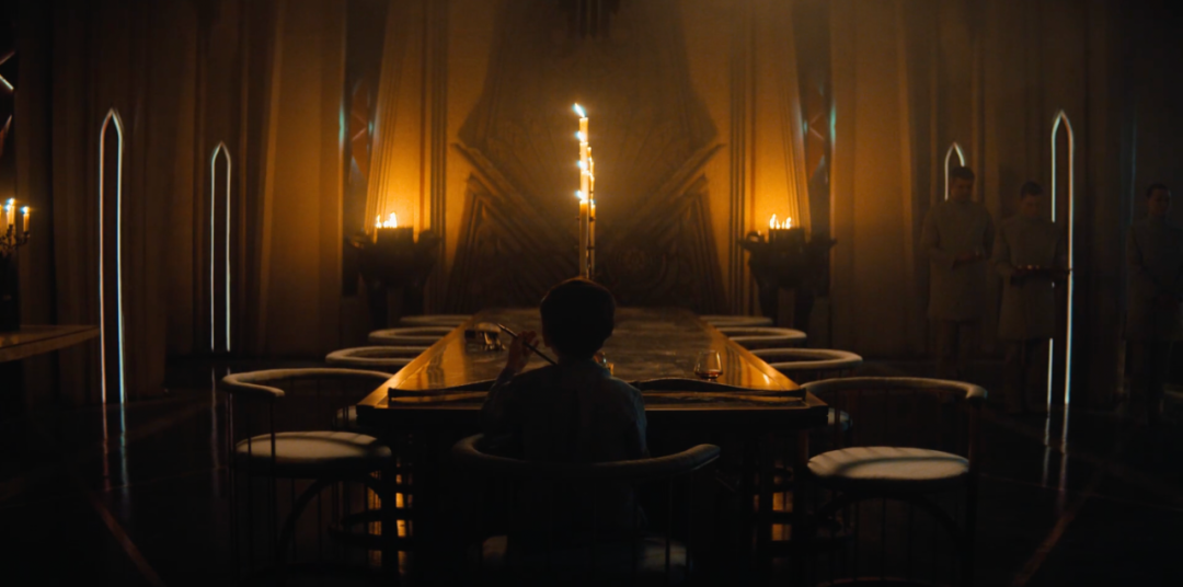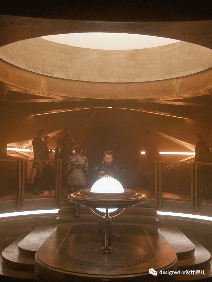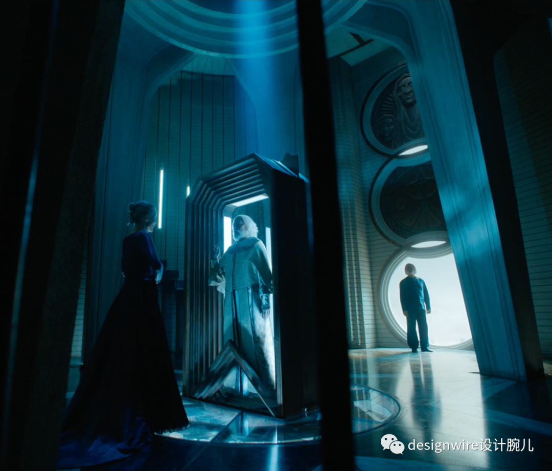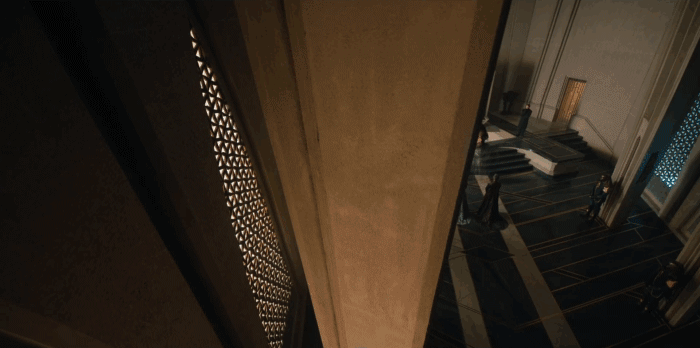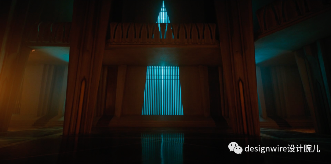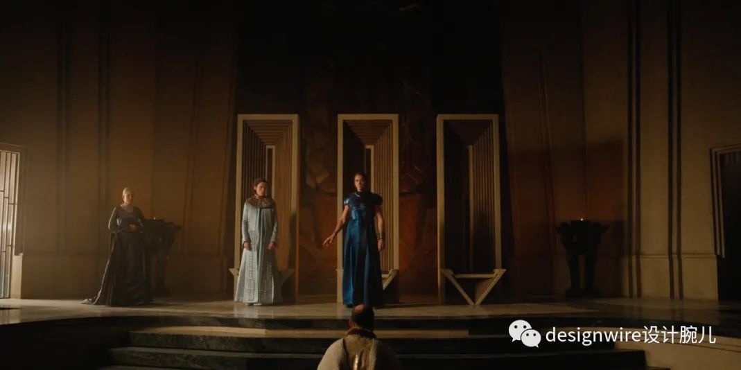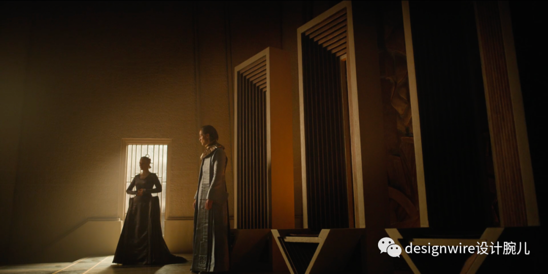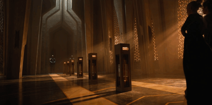 步入宫廷的克里昂大厅,摆放着由漂浮沙粒所呈现克里昂家族历代先帝的全息遗像“Sandogram”,被V字形廊柱之间的光线,透过细密的窗户纹理下照亮。