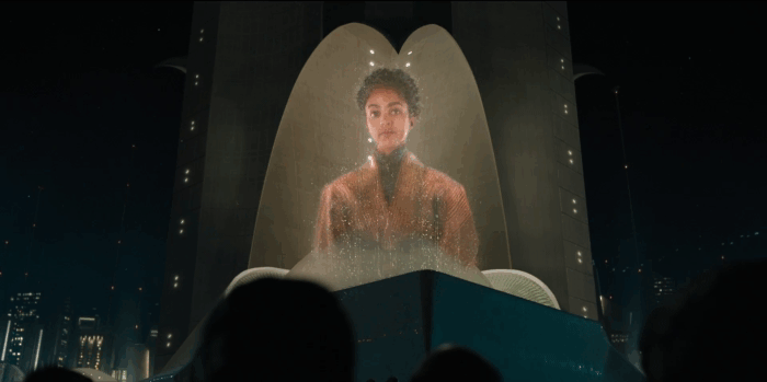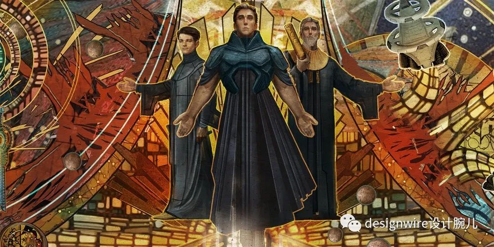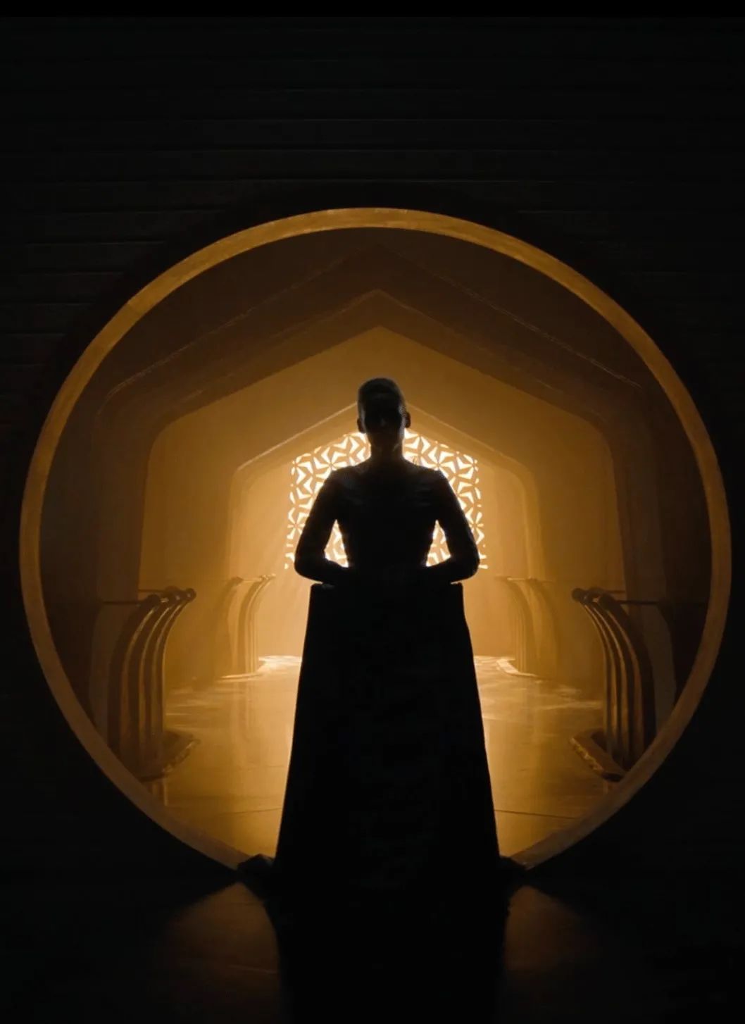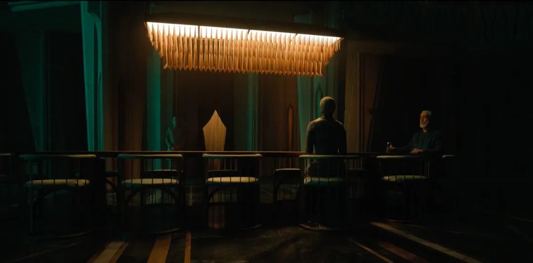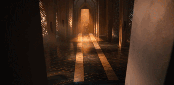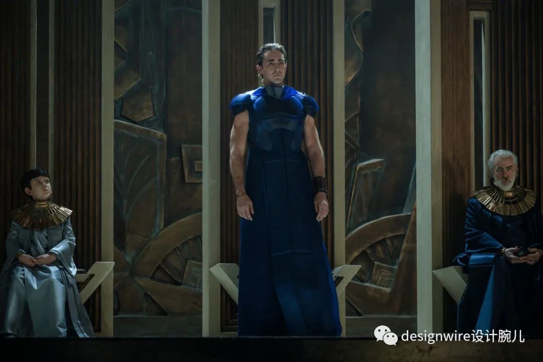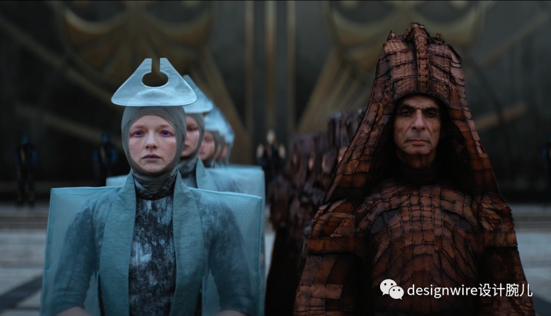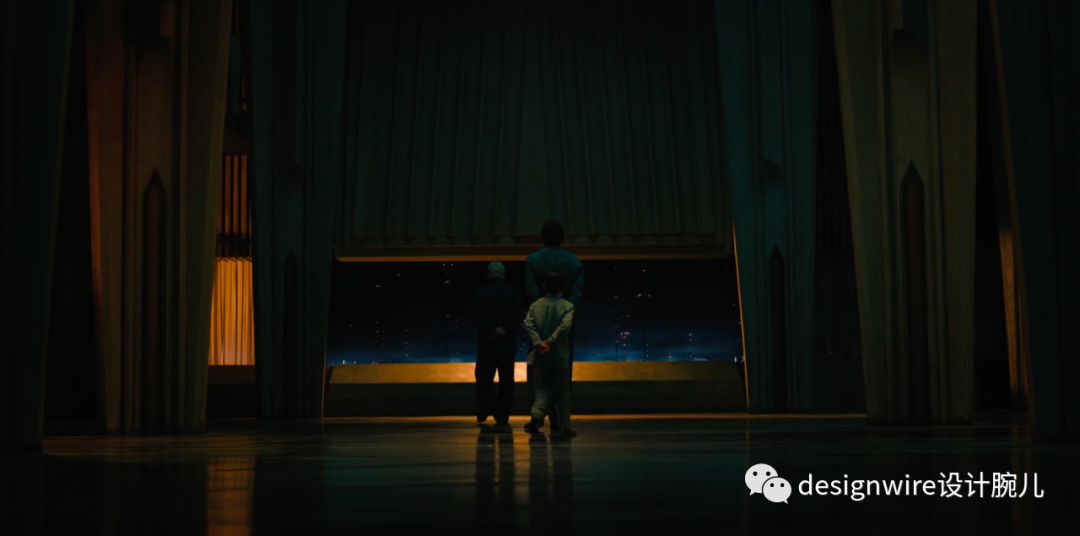 步入宫廷的克里昂大厅,摆放着由漂浮沙粒所呈现克里昂家族历代先帝的全息遗像“Sandogram”,被V字形廊柱之间的光线,透过细密的窗户纹理下照亮。