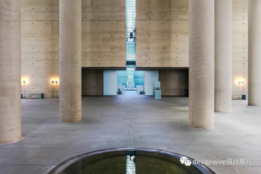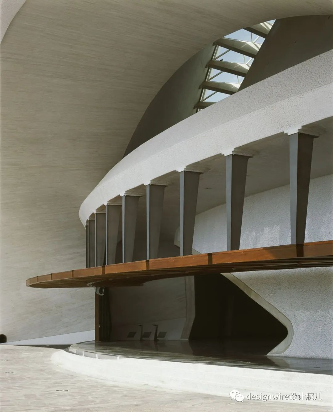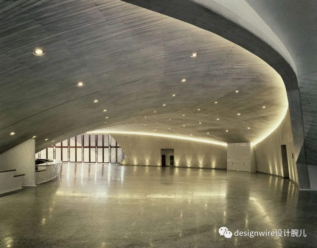 下方两侧宽大的拱门横跨50米,随着玻璃门拉起,人流和宜人的岛风一起涌入这一纯净而庄严的空间,自然的空气流经混凝土外壳和内壳之间的区域,与切面渗下的阳光相遇。