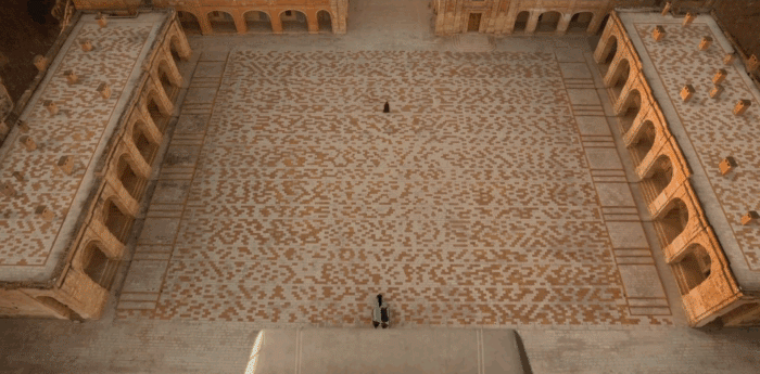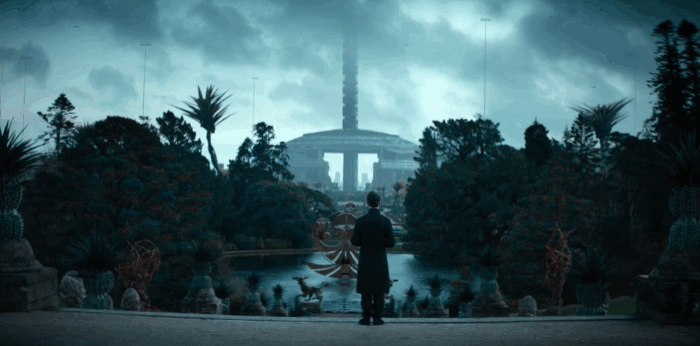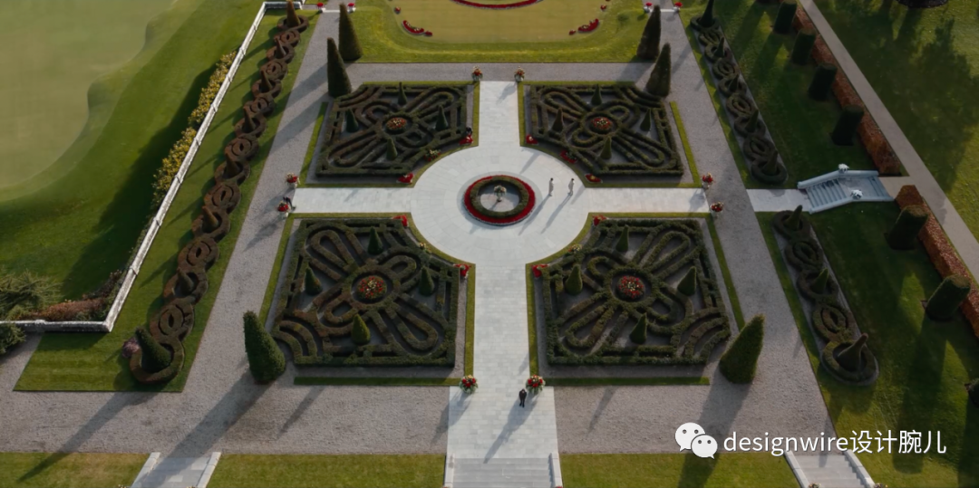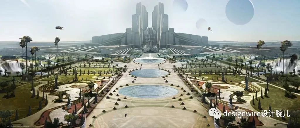 中心对称的川陀宫殿园林以高筑的围墙和石像为背景,从外围直指中心的单体式块状建筑,棱角分明的刚性彰显着帝国皇帝的统治地位。