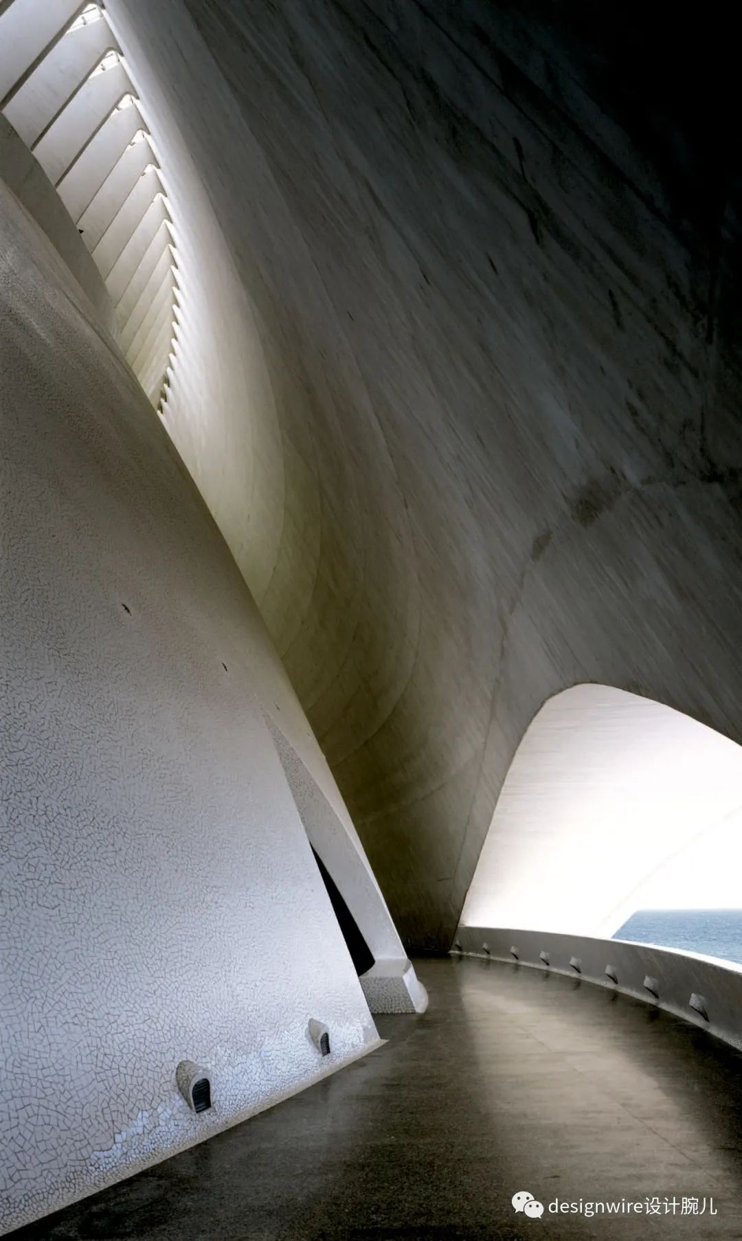 建筑呈现亮白色,飘逸的流线形外壳是由两个相交的圆锥体构成,随着切面变窄变细,构成指向礼堂入口的尖角,让人联想起迎面扑来的海浪和展开的船帆。外壳从当地玄武岩火山石覆盖的公共广场基座升起,动态的坡度变化连接着相邻不同水平高度之间的道路。