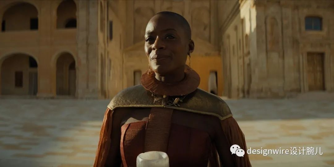 少女星人物形象设计:服饰色彩来自取景地马耳他的砂岩,飘逸裙摆、轻薄面料与质朴金属首饰则进一步凸显女性刚柔并济的一面。