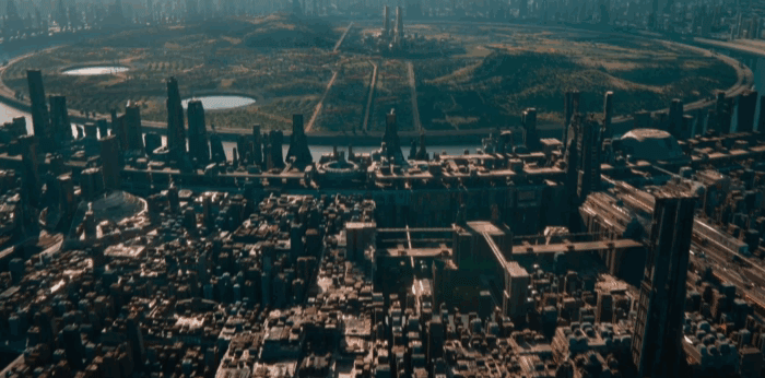 整颗行星以粗犷主义的建筑风格,和复杂的分层式结构设计为基础,从气派的帝国建筑和中心绿洲,向外放射形发散出一座完整的科幻城市,相互之间由通道连接。
