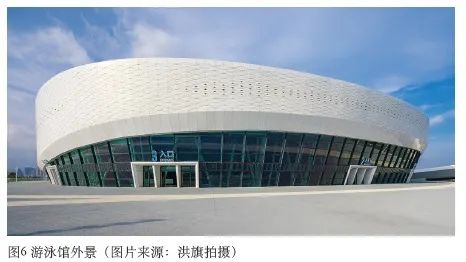 游泳馆作为第18届世界中学生运动会部分水上项目赛事场馆,主要包括跳水池、比赛池、热身池、戏水池及陆上训练区,建筑面积27 000m2,最多可容纳2000名观众,可承办游泳、跳水、花样游泳、水球等国际单项比赛,赛后可开放供大众健身使用。游泳馆外景见图6。