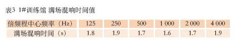 参考《剧场、电影院和多用途厅堂建筑声学设计规范》GB/T 50356-2005和《体育场馆声学设计及测量规程》JGJ/T 131-2012,并考虑训练馆的具体情况确定,中频(500 Hz~1 000 Hz)满场混响时间小于1.8 s。训练馆在无人占用、空调运行达到使用工况时,噪声限值应满足噪声评价曲线NR-35要求。大厅内不得出现明显的回声、颤动回声和声聚焦等音质缺陷。