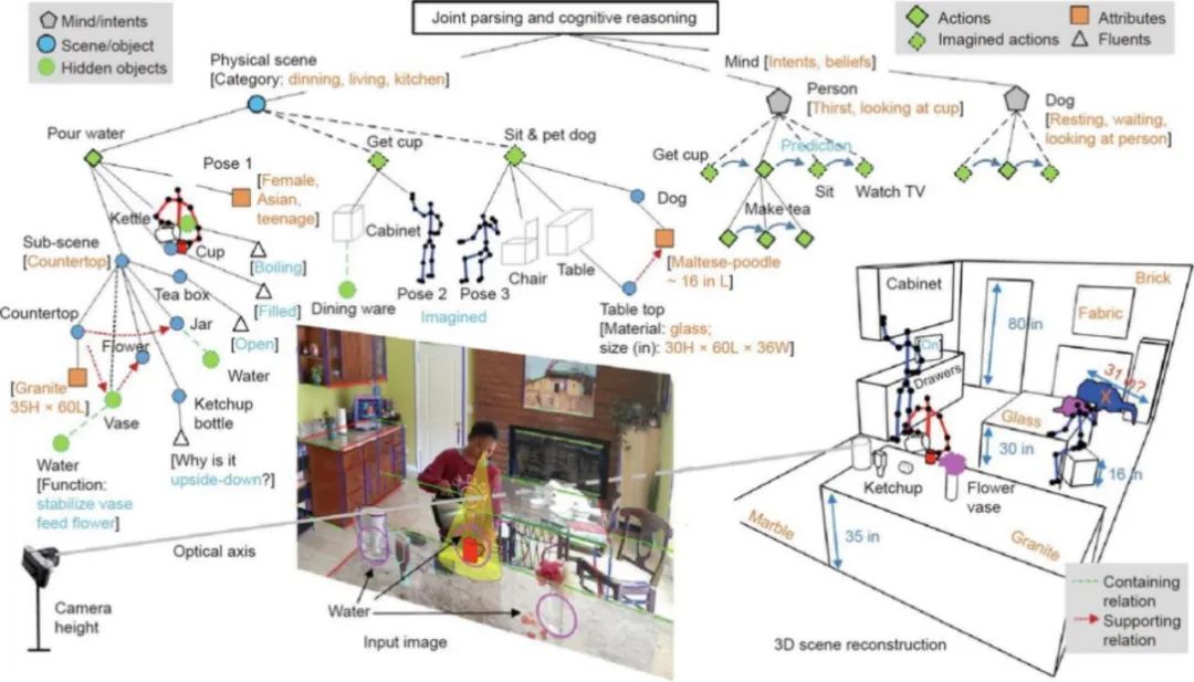目前已经成熟的三维场景理解,更多的是回答“what”和“where”的问题,即这个物体是什么以及它在哪里,而holistic 3D scene understanding 则是在此基础上,去探索“why”、“how”和“when”的问题,这需要对图片中的物体间底层逻辑关系有更深的理解,其难度也更大。现有的AI具有识别能力好、检测能力强、对于特定任务的准确率高等优点,但是不足之处在于:单个小任务往往需要前期巨大规模的数据训练,且表现不稳定,训练方法较简单。目前的AI,虽然在某些能力上超过了人类,但是在学习效率、掌握知识的灵活度、全面性、泛化能力上与人类还有较大差距。另外,人类在其他方面也表现出AI所不具备的优势:比如人类擅长在有限数据中学习多个任务,在交互中学习、以及人类的学习是不需要标签的等等。因此human-like holistic方法结合认知科学和神经科学对于人类认知机理的研究,对现有的三维场景理解进行改进。就像人一样,AI对于周围场景主要进行四个动作:感知,交互、学习和推理。黄思远博士着重介绍了前两部分。