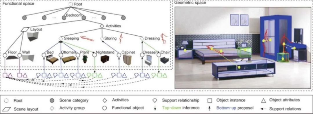 场景的表达,可以分为基于几何空间的表达和基于功能空间的表达,在几何空间中,表达出的是物体最基本的几何特征,而在功能空间中,表达出的是人的行为、人和场景所可能产生的交互等信息。通过analysis-by-synthesis、joint inference: depth、normal、segmentation等计算方法,进行初步的对环境的快速重建,接着采用map inference\mcmc with simulated annealing 的方法进行场景的优化。实验结果显示对于体积大的物体该方法有较好的效果。
