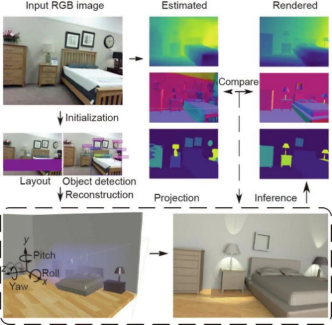 可以想像,从单张图进行人和场景的综合重建,是十分困难的,困难在于单张图中存在的物体间的遮挡会造成很大程度的信息缺失,针对这一问题的解决方法是:借助于人和场景交互相对关系的先验知识,来弥补信息不足的问题。考虑到现实世界中采集这些数据集成本很高,可以从大型游戏比如GTAV中抽取丰富的人和场景的交互信息作为先验知识,用来做场景重建。