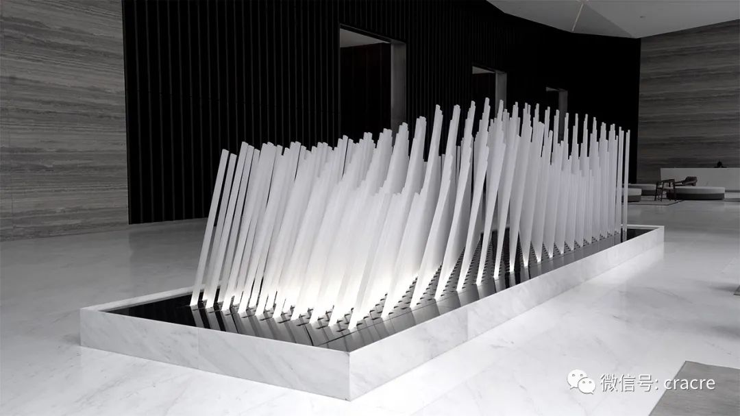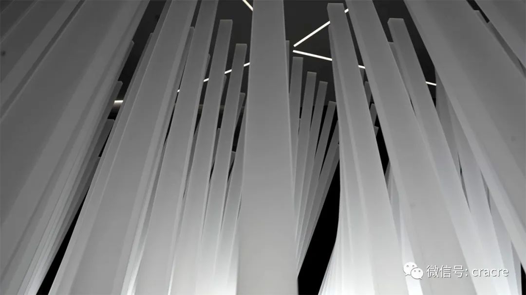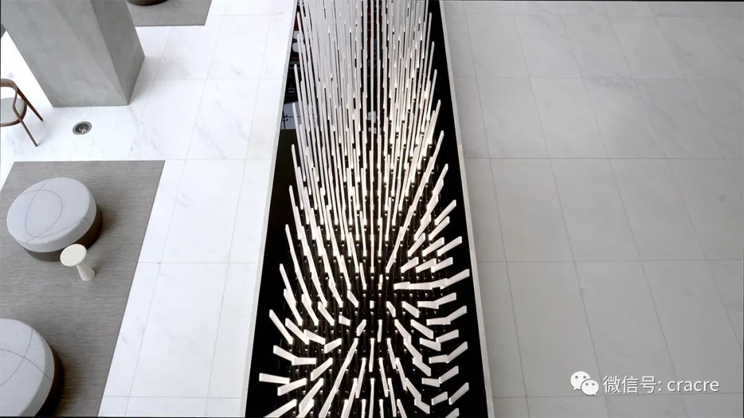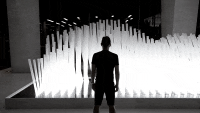 装置原理:摄像头捕捉到人像后,软件驱动机械部分,400根灯光“芦苇”点亮,并随之摆动;