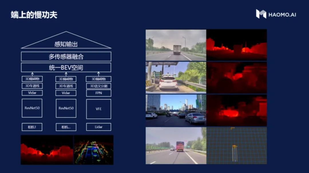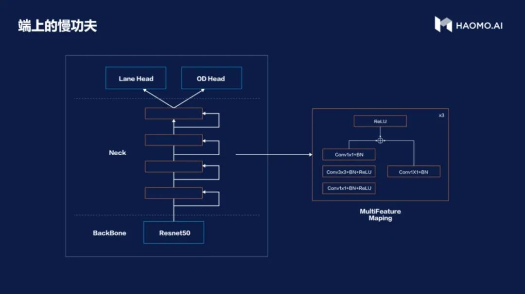 除了选择这样一个硬件之外,我们对于端上的学习模型也有自己的考虑。整体来说业界在这方面使用的方式结构是比较类似的,主要使用一个主干网。其中毫末智行使用的主干网是ResNet50。不同的是,我们向其中加入了一个多特征的聚合层,当特征经过了主干网以后,所有的特征都会通过中间的聚合层再做一层处理。这之后众多特征会被分成不同的维度。有的识别障碍物,有的识别车道线、有的识别行人,和每一类模型独立识别的方法相比这种方式的效率会更高。