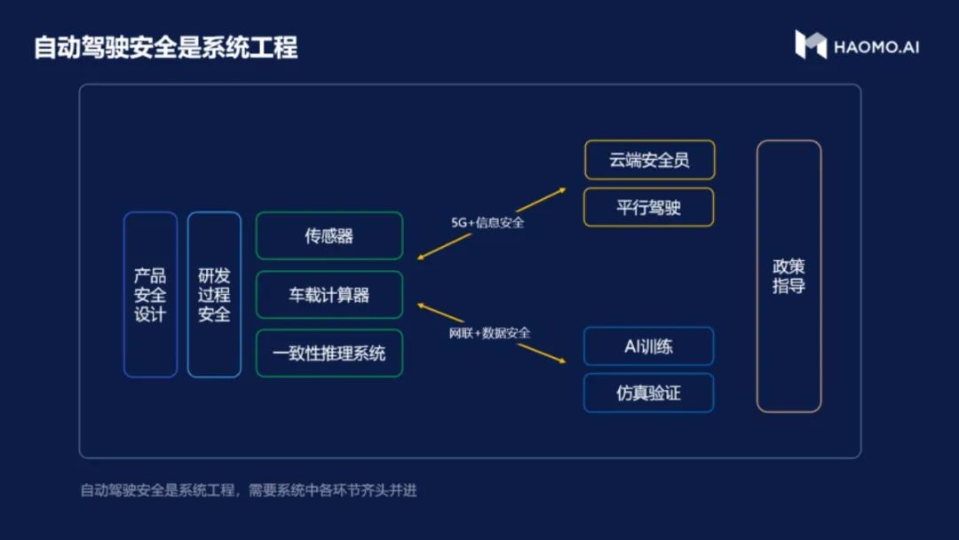 安全是一项系统性工作,首先要保证设计的安全,其次是研发过程的安全。此外还需要保证传输网络和数据安全、以及平行驾驶和远程控制过程中的5G和信息安全。