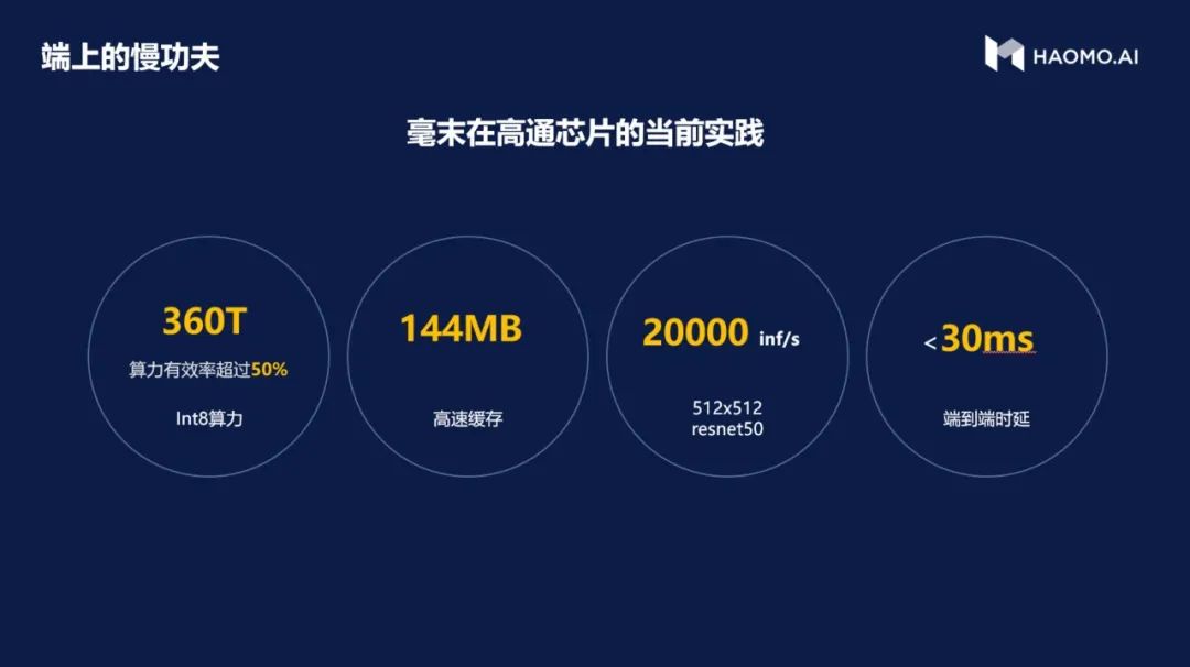 我们在选择车端芯片的时候考虑到了功耗、成本和整体的计算能力等问题。在英伟达、高通,以及诸多国内品牌间做了很长时间的对比,最后选择了高通芯片。高通的芯片除了算力优势外,已经在很多量产车上实现了落地应用。根据我们对于算力的评估,毫末智行硬件算力的有效率目前能达到50%,整体硬件的算力差不多是360T。在360T的计算硬件里面搭载100多M的高速缓存,这两个特点至关重要。利用这样的硬件特点,我们用一些标准化深度学习的模型,例如ResNet50限制一个图片大小,这种情况基本上可以达到每秒钟2万帧的状态,每一帧的识别效率可以达到30毫秒以内。