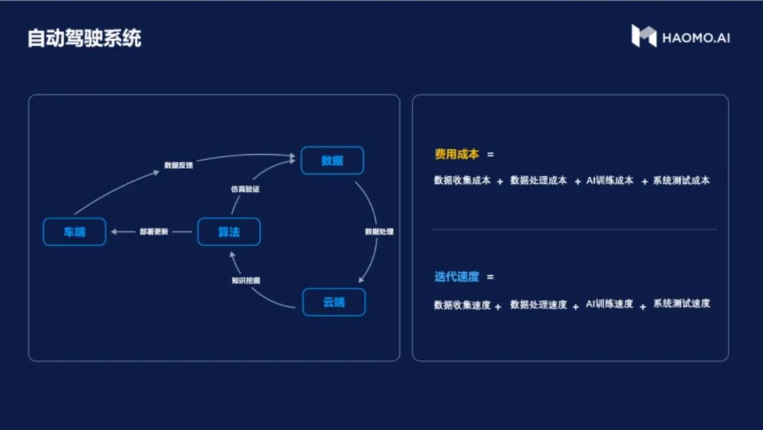 在这个闭环当中,有很重要的两个公式:一个是成本,另一个是迭代效率。首先成本包括收集数据的成本、存储数据的成本、训练数据的成本。需要寻找一种模式能够极大程度降低这个成本不断发展?另外是在互联网行业和移动互联网行业所积累的迭代速度。