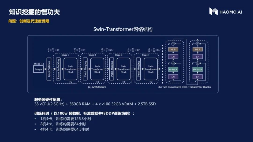 在解决了模型的识别与补充后,我们发现收集到的数据越来越多,因为用户使用的规模越来越大,基础数据和样本数据规模快速增长。在这种情况下如何能够加速训练?我们在云端采用了Transformer等模型。通过简单比较,发现如果用1机4卡的硬件配置,用100万帧的数据规模训练一个数据,差不多要100多个小时才能够训练完成一遍。但AI训练可能会遇到过很多突发情况,例如模型需要调整或者各种问题引起的训练终止,所以真正完成训练的时间只会更长,这成为了阻碍迭代产品和创新的一个重要问题。