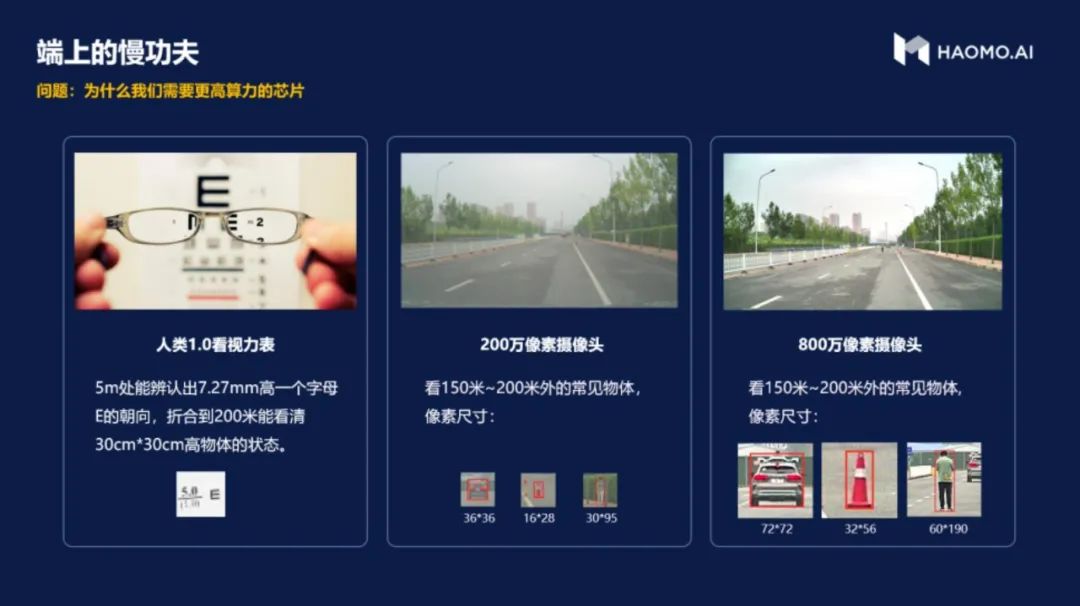 为什么会有这种增长?其实核心还是由传感器信息量的变化所带来的端上计算能力的增强。很明显的是像素的变化,现在主流的汽车基本上都是100万像素的摄像头。但是今年已经开始出现,并预计来会变成标配的是800万像素。从100万到800万像素,单张照片的信息量就会扩充很多。另外每个车所搭载的摄像头也会越来越多,现在主流的车只有几个。到更长一段时间之后,当大家逐渐把整车都武装起来,每个车差不多会配备有12个或者14个摄像头。单个摄像头像素的增加和整车摄像头个数的增加,导致了在车内需要一个更强算力的计算器,这也是大家不断的在比拼车端的算力原因。