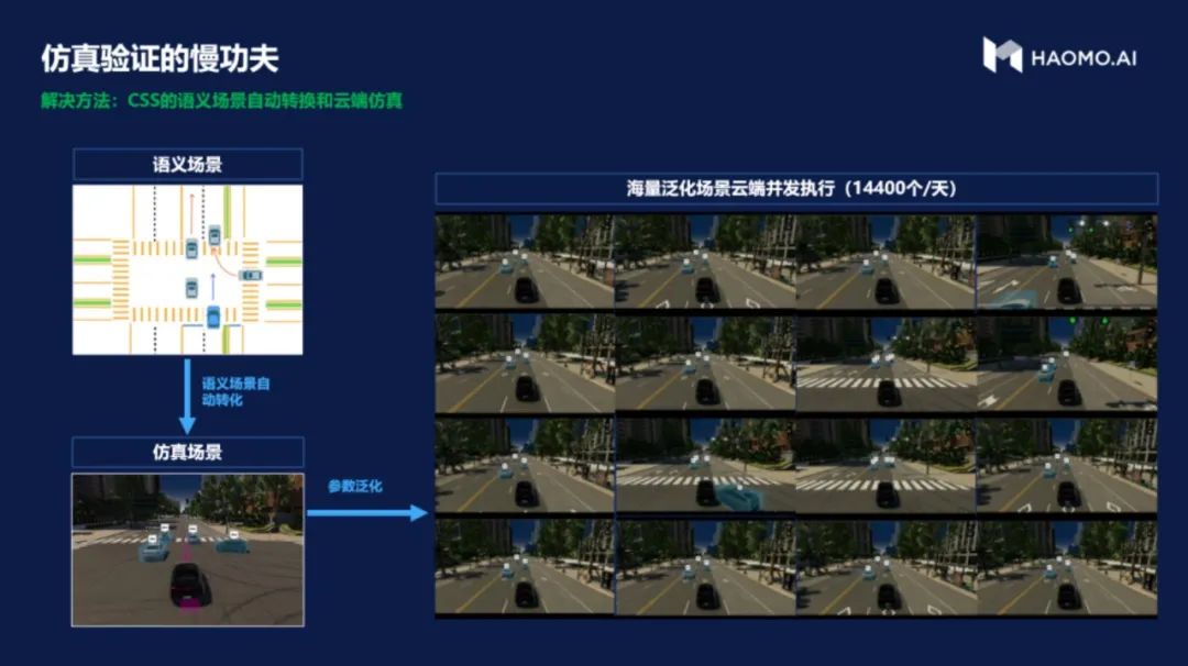 但是如果把这种状态又落回到真正验证的时候,又需要让它产生更多的爆炸,这种爆炸就也需要通过语义化仿真的工具,把用语义化描述的场景再做更加量化的场景扩充,然后再用仿真更多的来验证。这样的话,仿真实验也可以在云端进行,整体仿真和验证的效率就得到了极大的提升,也可以加快技术整体的迭代速度。