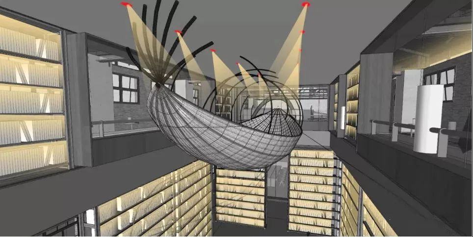 船型装置艺术品采用多个射灯提供重点照明,辅以发光灯带强调造型轮廓,同时有效避免眩光。